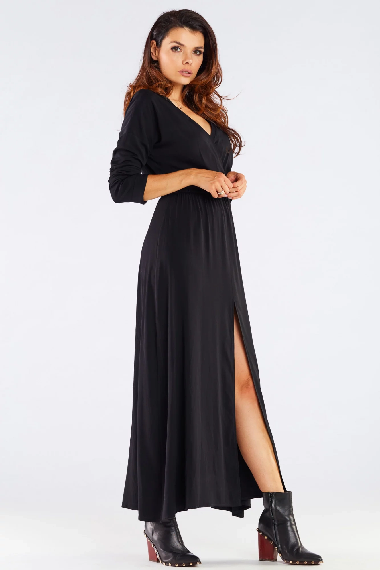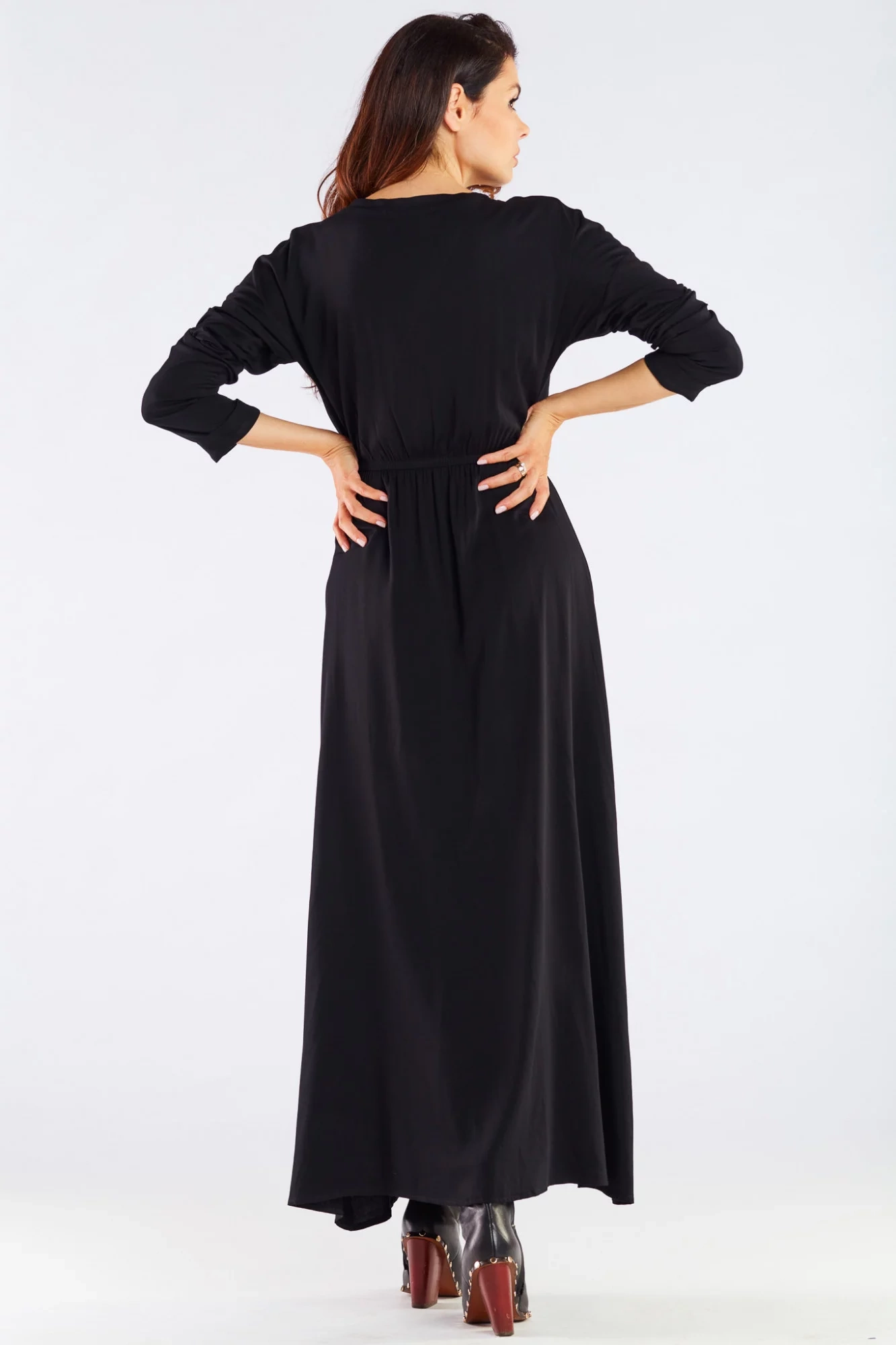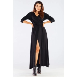 Maxi, mimoriadne ženské šaty. Dlhé rukávy a dĺžka sú ideálne pre chladnejšie dni. V kombinácii s čižmami a koženou bundou bude dokonalým riešením na rande, do práce alebo na stretnutie s priateľmi. Zips na prednej strane dodáva šarm a ženskosť. Vyrobené z prírodnej, telu príjemnej viskózy. Produkt je vyrobený v Poľsku.