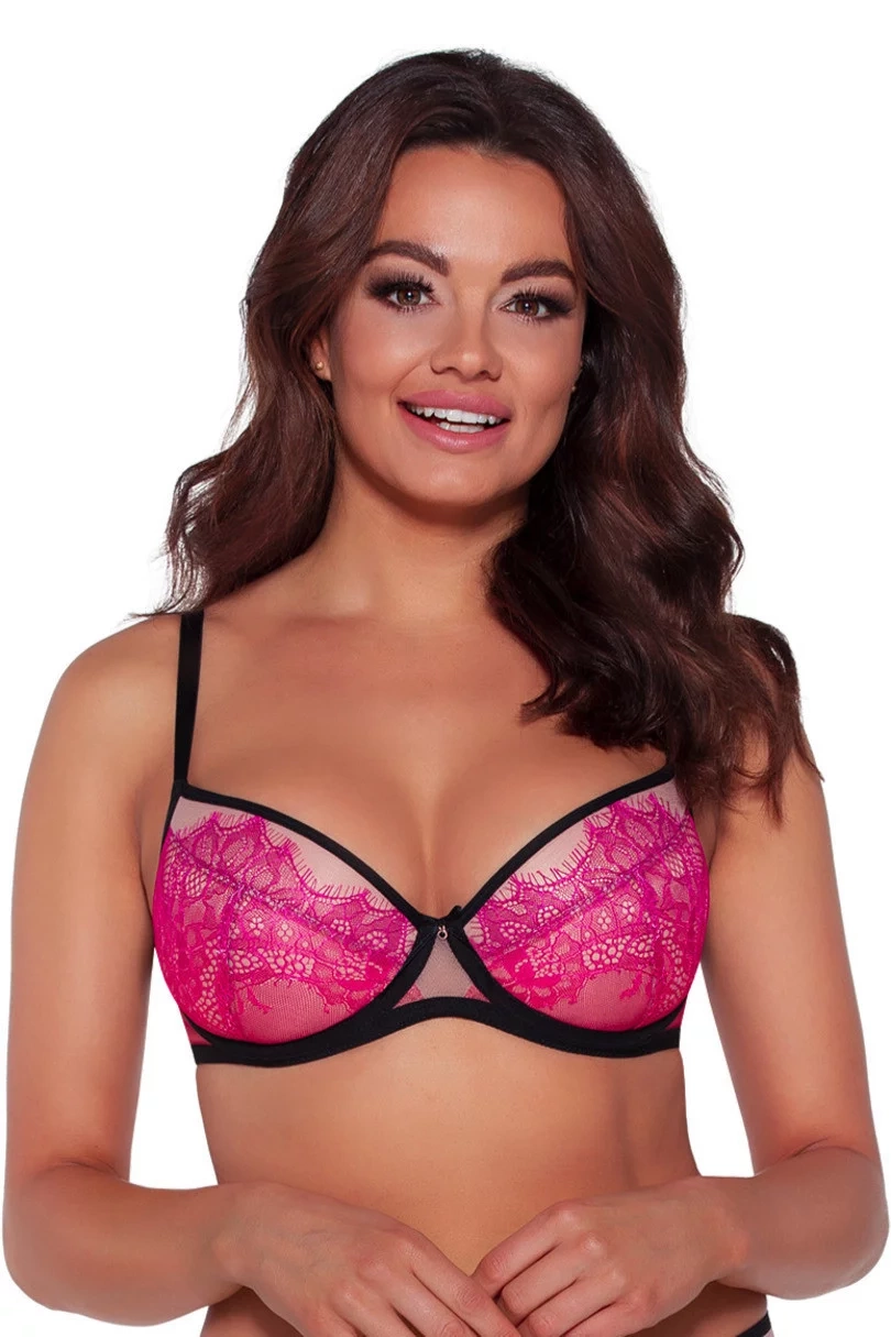 Energetický ró odráža farbu letnej aury, preto nesmie chýbať v prázdninovom stylingu. Model AV 2031 ponúka kontrastnú farebnú kombináciu – béžovú penu pokrytú tylom telovej farby a jemnou čipkou, všetko orámované čiernymi ramienkami. Podprsenka push-up náležite podopiera lákavo vyvýšené prsia a koketne ich odhaľuje vo výstrihu, zatiaľ čo dievčenská mašlička na spojnici pŕs dodáva na pôvabe. Dôverujte prepychovému Ambre!