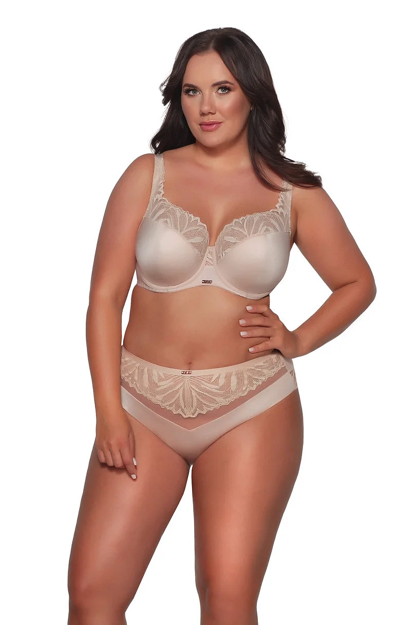 Miseczki wyścielone zostały w dolnych partiach miękką pianką, którą od zewnątrz pokryto elastyczną dzianiną. Górną część miseczek tworzy zaś gęsto tkana florystyczna koronka, która gładko przylega do kształtu piersi i stopniowo pnie się po ramiączku. Ozdobny mostek i sprężysty obwód rozświetlone zostały metalową blaszką z logotypem, umieszczoną nie tylko w centralnym punkcie między piersiami, ale także z tyłu przy zapięciu.