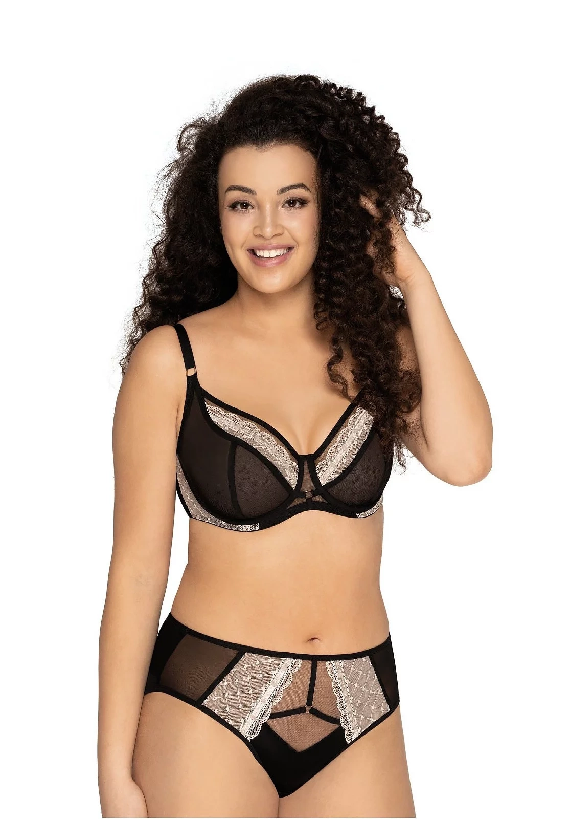 Podprsenka je vyrobená zo sieťoviny a čipky. Košíčky s kosticami sú do polovice vystužené a vo vnútri sú pokryté bavlnou. V mieste spojenia košíčkov sú ozdobné pásiky. Obvod modelu je ušitý z pružnej lycrovej tkaniny, ktorá sa pri nosení nevyťahuje. Ramienka je možné nastaviť, ale nemožno ich odopnúť. Podprsenka má strih a konštrukciu typu 925.