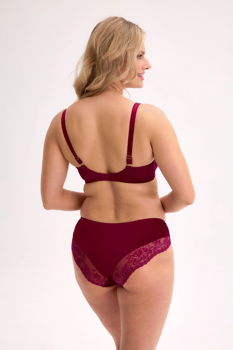 <p>Biustonosz semi soft w odcieniu głębokiego bordo to propozycja dla kobiet, które cenią sobie elegancję i perfekcyjne dopasowanie. Konstrukcja tego modelu została dopracowana z myślą o maksymalnym komforcie i efektownym wyglądzie – ramiączko płynnie łączy się z usztywnioną częścią miseczki, co gwarantuje stabilne podtrzymanie biustu. Misternie haftowana koronka delikatnie okala miseczki i zmysłowo wyciąga się aż na ramiączka, tworząc luksusowy efekt wizualny. Ten model doskonale sprawdzi się zarówno na co dzień, jak i na wyjątkowe okazje – zawsze wtedy, gdy chcesz czuć się pięknie i pewnie siebie.</p> <p>Skład: 53% Poliamid, 20% Poliester, 14% Bawełna, 10% Elastan, 3% Poliuretan</p>