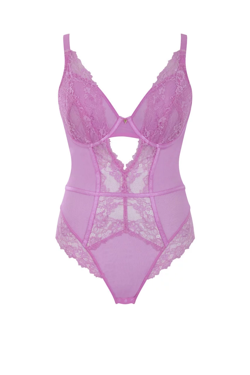 WiredPlunge bra shape within the bodysuitHigh apex outer lace gives a luxurious feelFully adjustable strapsSheer mesh panellingGorgeous pink shadeCare instructions: