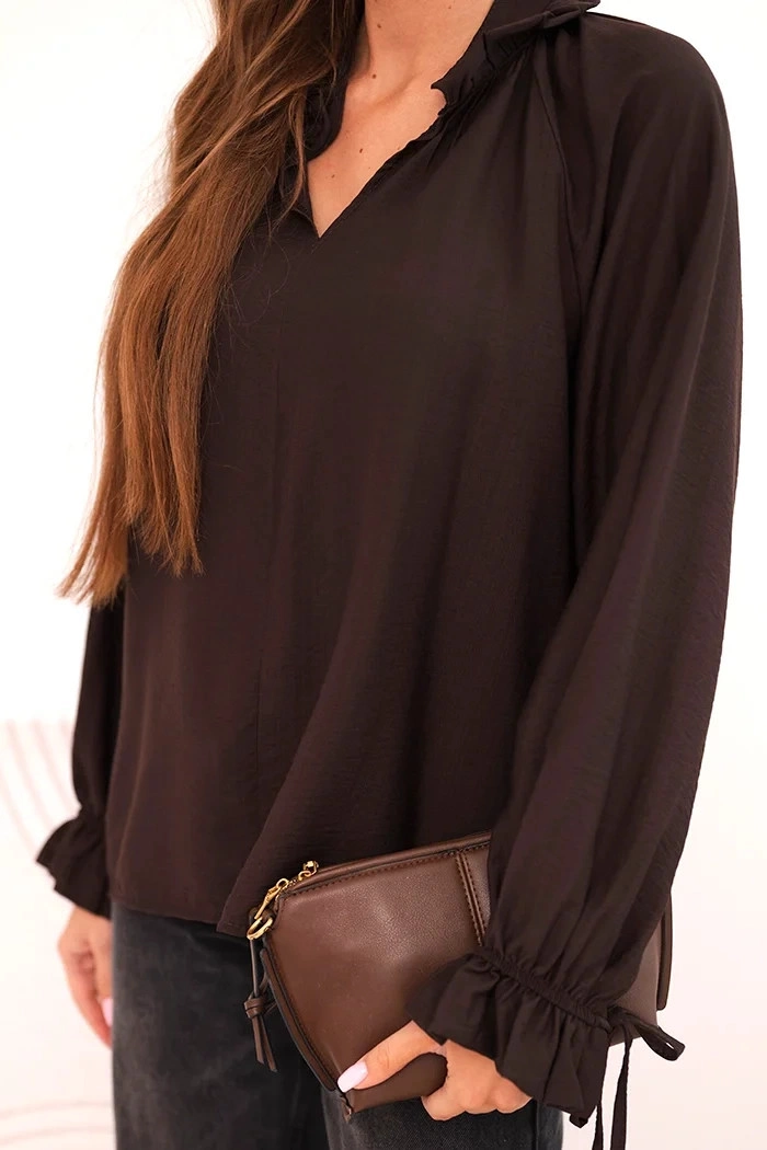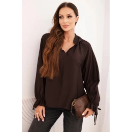 Výstrih v tvare písmena V jemne zvýrazňuje krk a ozdobné šnúrky na rukávoch dodávajú celku ženský pôvab. Blúza sa dokonale hodí ako ku sukni, tak k nohaviciam s vysokým pásom, čím vytvára elegantný a zároveň moderný vzhľad.
