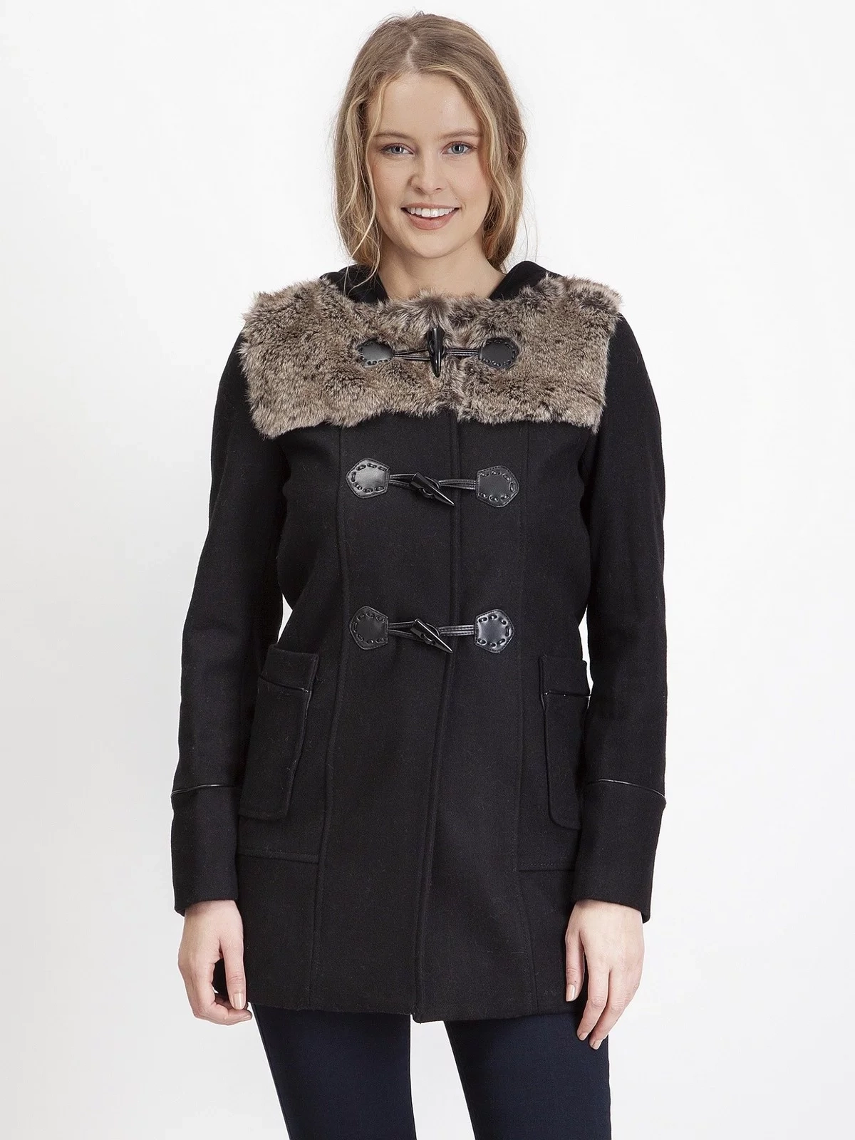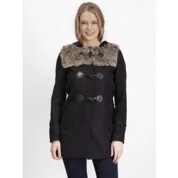 Dámsky zimný kabát s kapucňou. Ekologická kvalitná dekoratívna kožušina na úrovni pŕs. Kabát sa zapína na štipce. Má dve vonkajšie vrecká. Vďaka mimoriadne mäkkej a odolnej tkanine sa v ňom budú všetky dámy cítiť skvele, takže naozaj stojí za to ho mať. Dodáva sa v čiernej farbe.