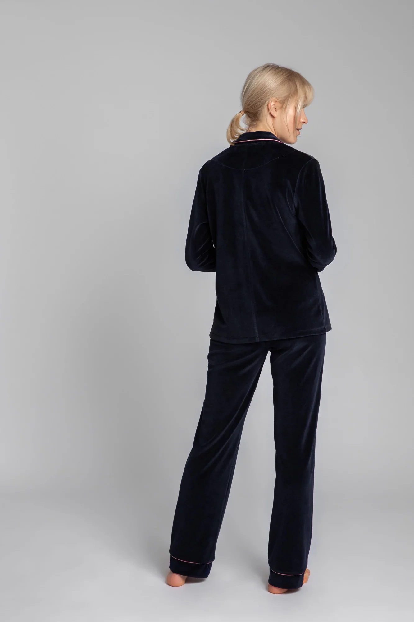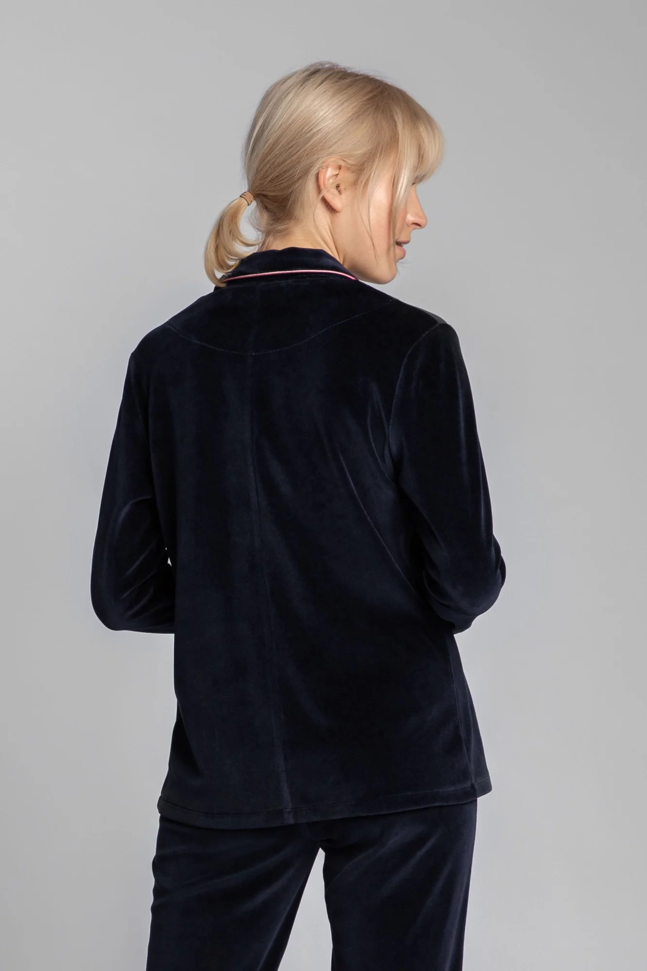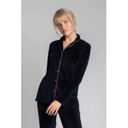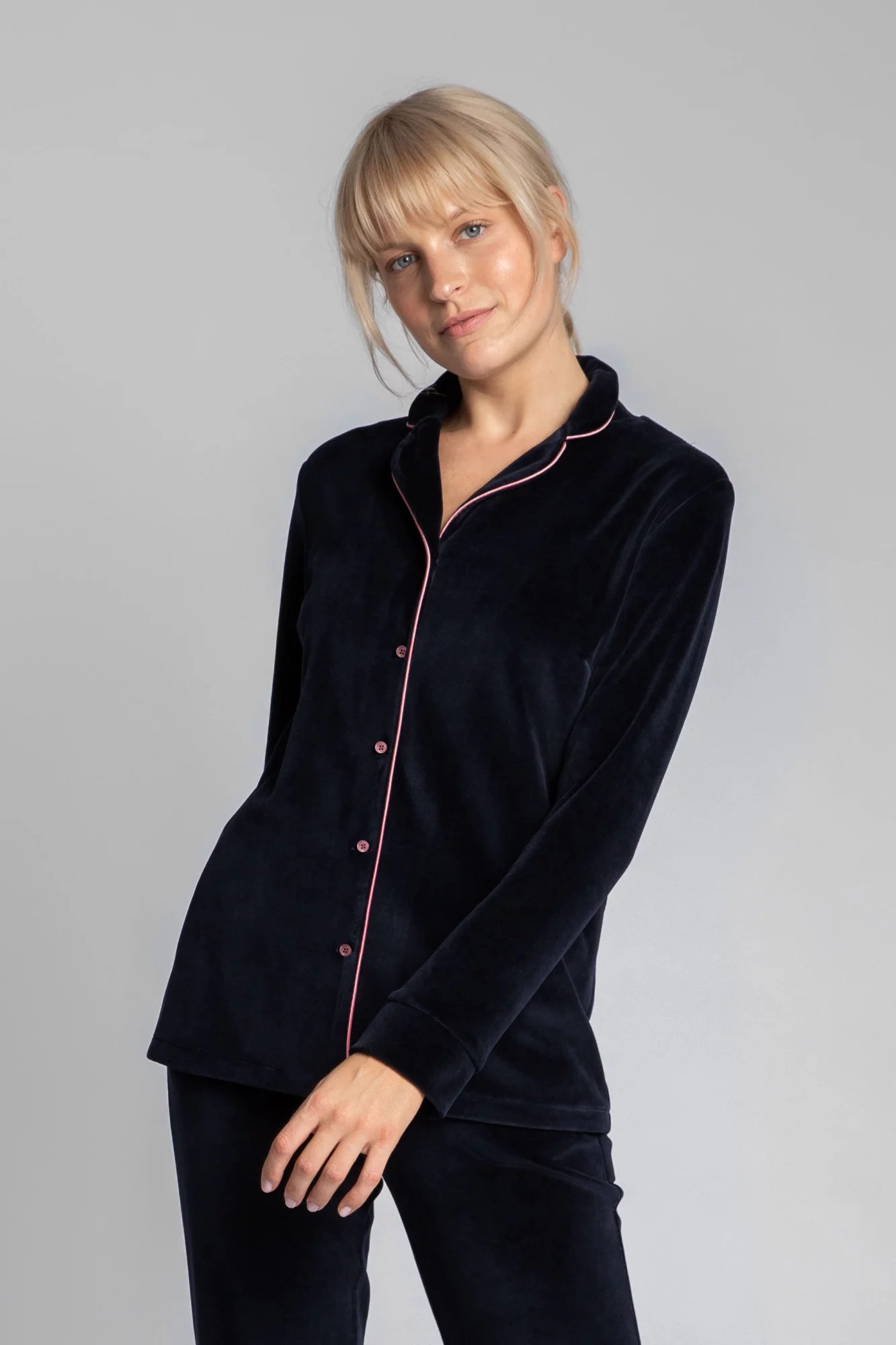 Luxusný zamatový pyžamový top s gombíkmi, vrúbkovaným golierom a ozdobným lemovaním pre lepší vzhľad. Košeľa sa najlepšie dopĺňa s našimi zamatovými pyžamovými nohavicami s ozdobným lemovaním.