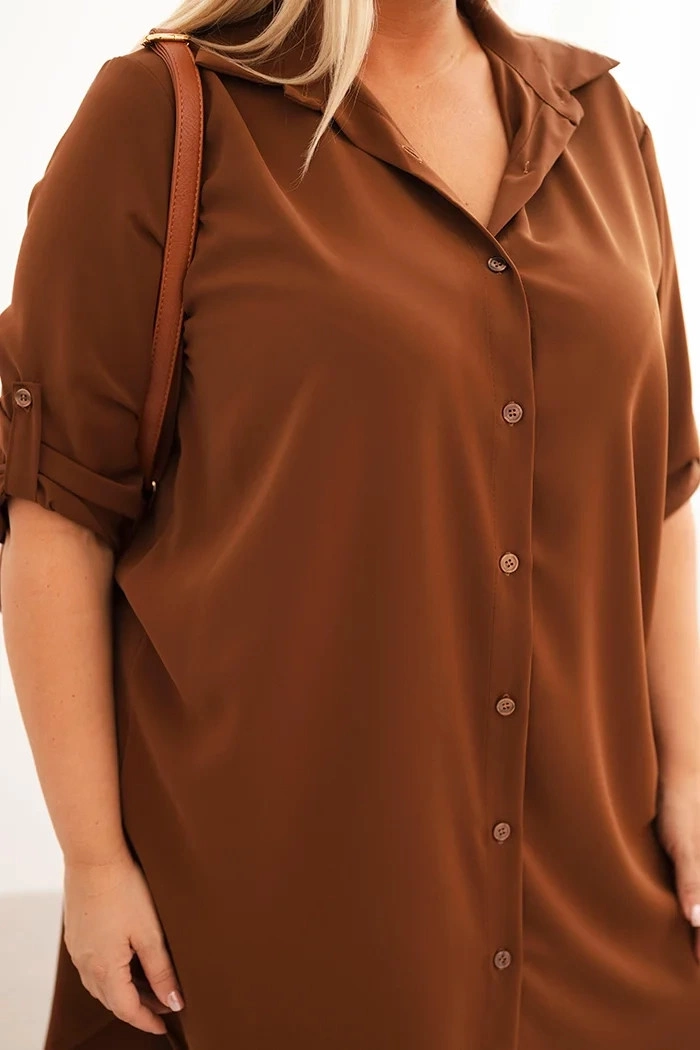 Dámske košeľové šaty Plus Size je dokonalou kombináciou elegancie a pohodlia v každodennom štýle. Jej voľný strih sa krásne prispôsobí postave a zaisťuje plné pohodlie pri nosení bez ohľadu na príležitosť. Klasický golier, gombíková léga po celej dĺžke a praktické rukávy 3/4 s možnosťou vyhrnutia robia tieto šaty univerzálnou voľbou na mnoho sezón.