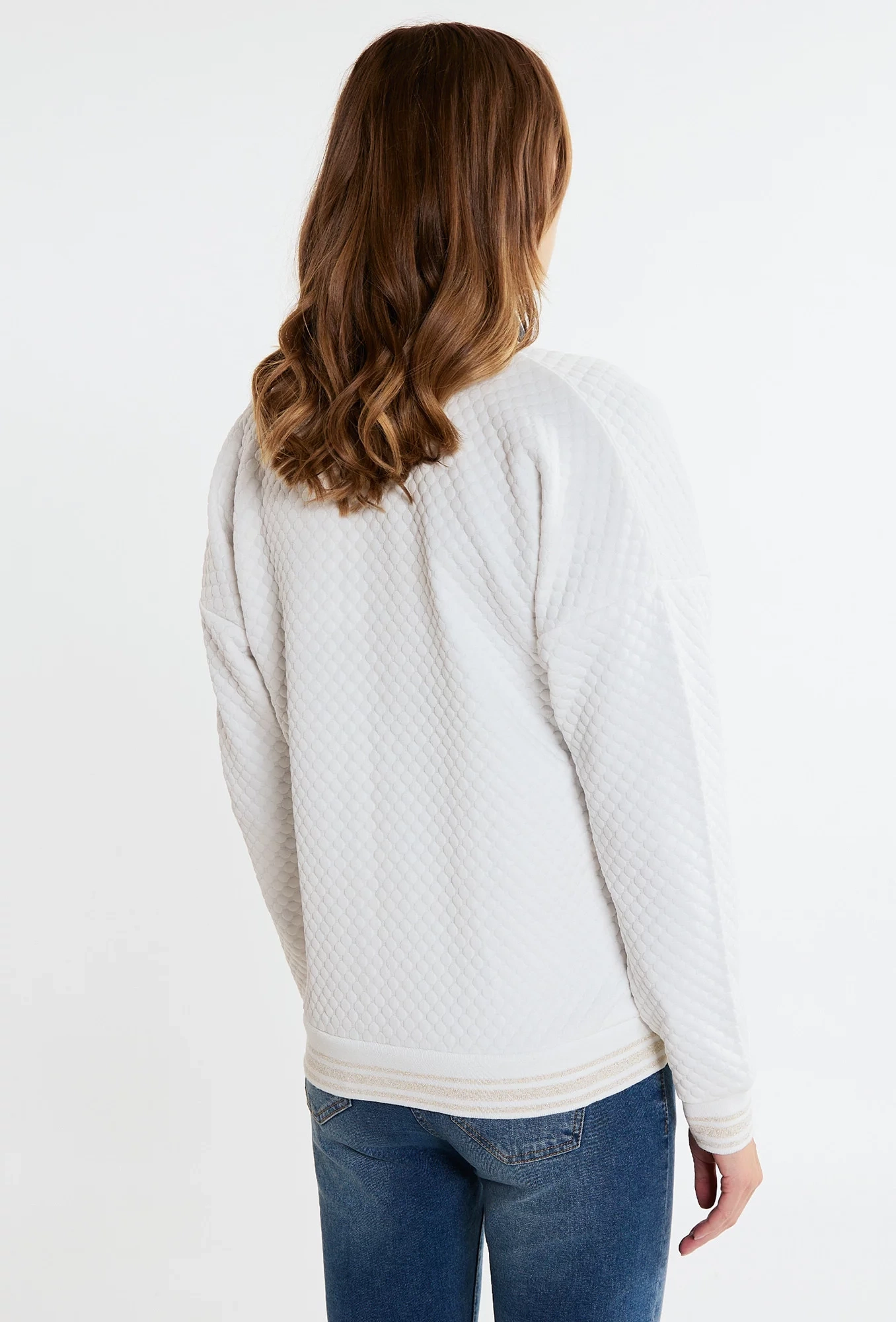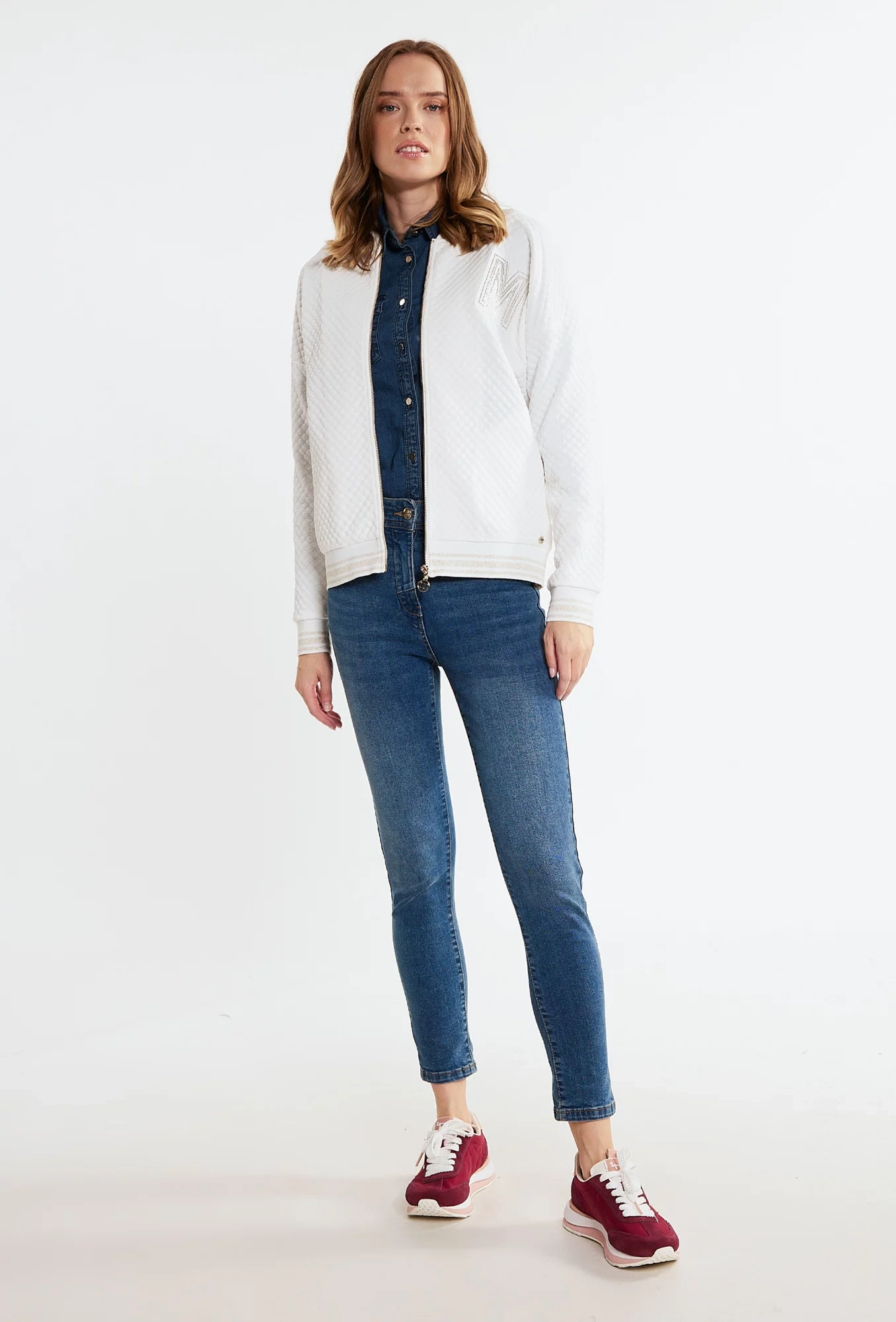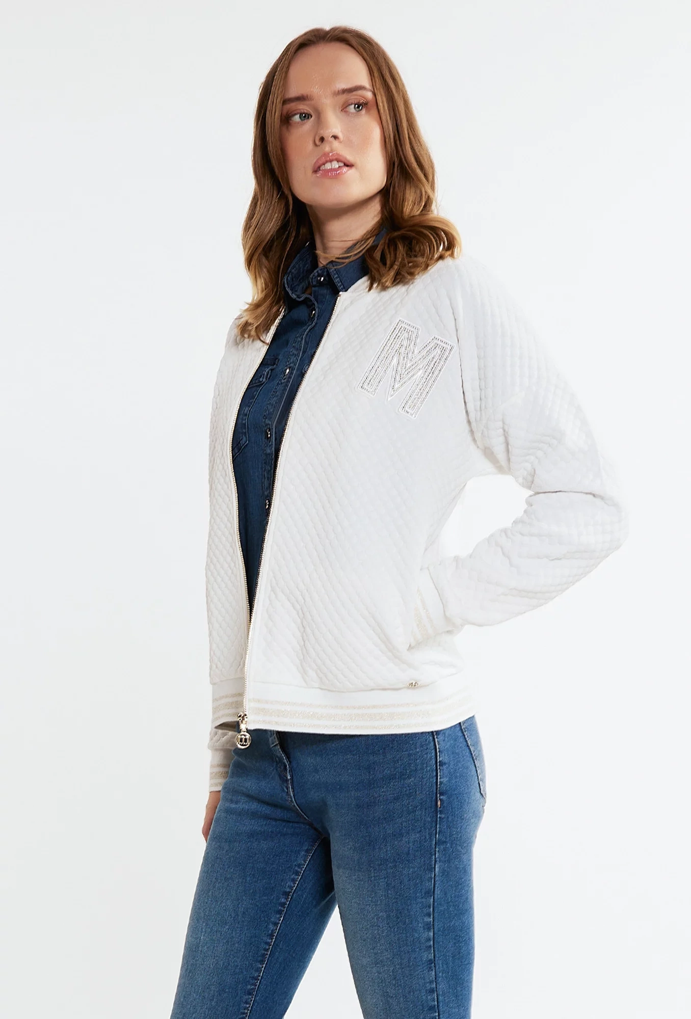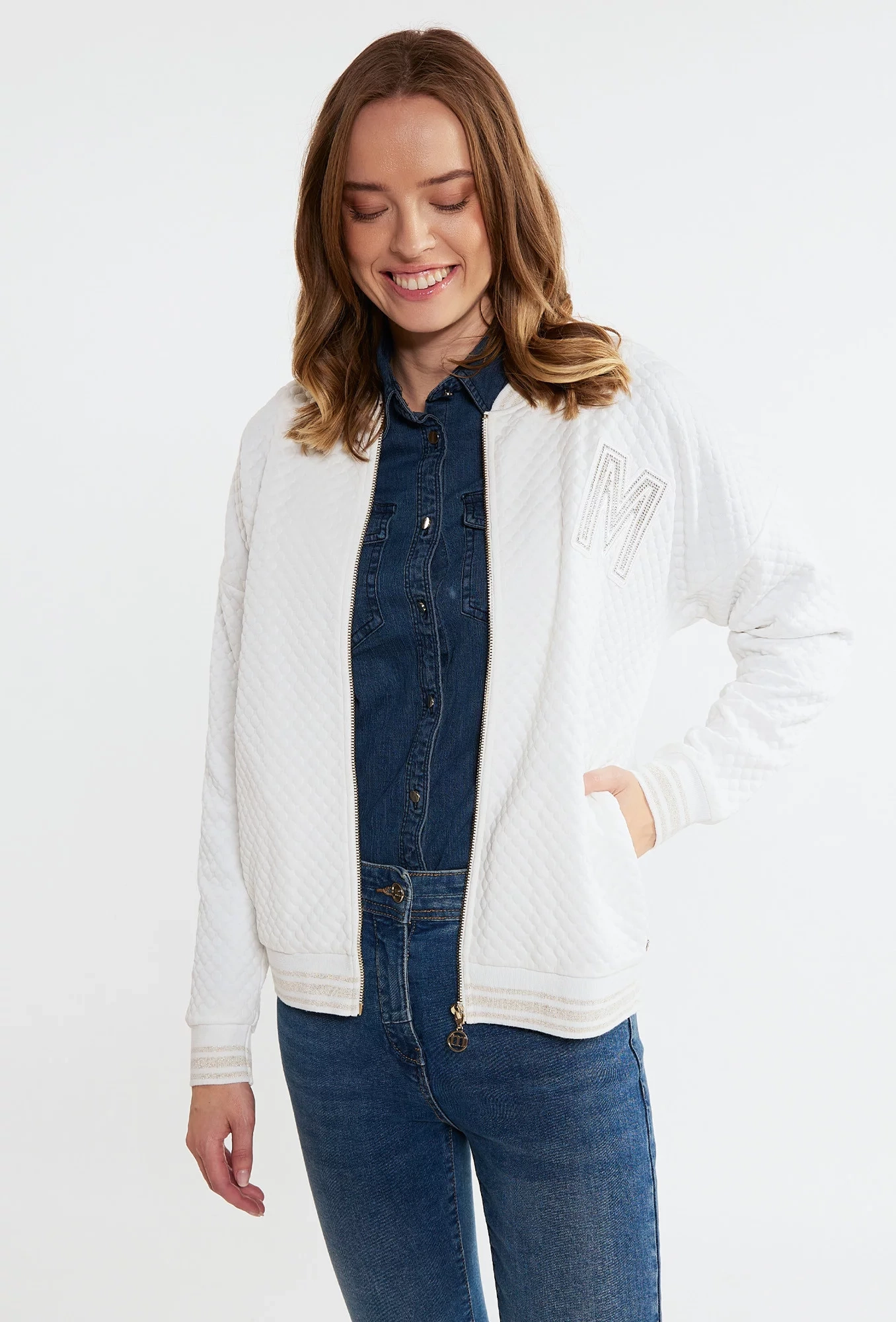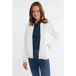 Dámska bunda s aplikáciou v podobe tryskového loga značky Monnari. Bunda s dlhými rukávmi, zapínanie na zips. Zapustené vrecká na bokoch. Tento model sa ideálne hodí ako doplnok na každodennú štylizáciu. Modelka na obrázku je vysoká 177 cm a má veľkosť 36.