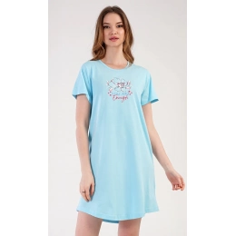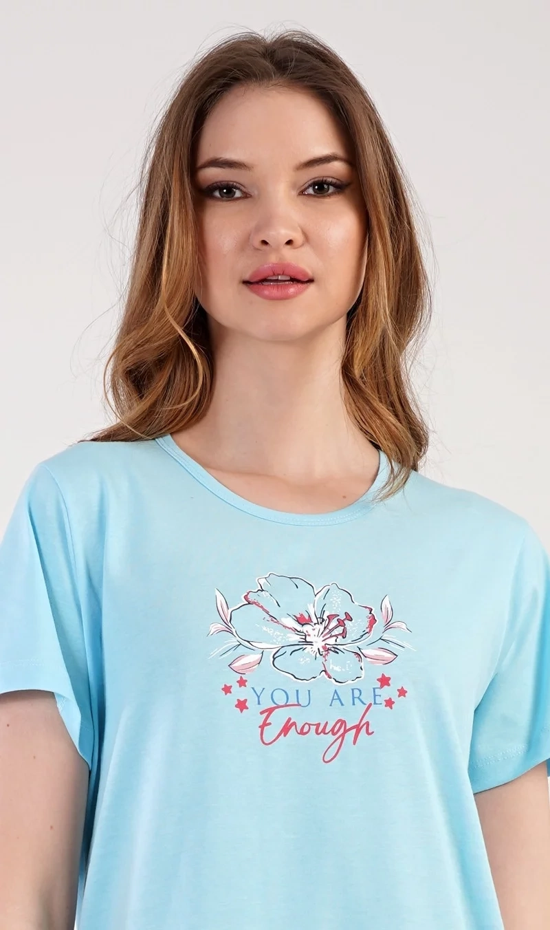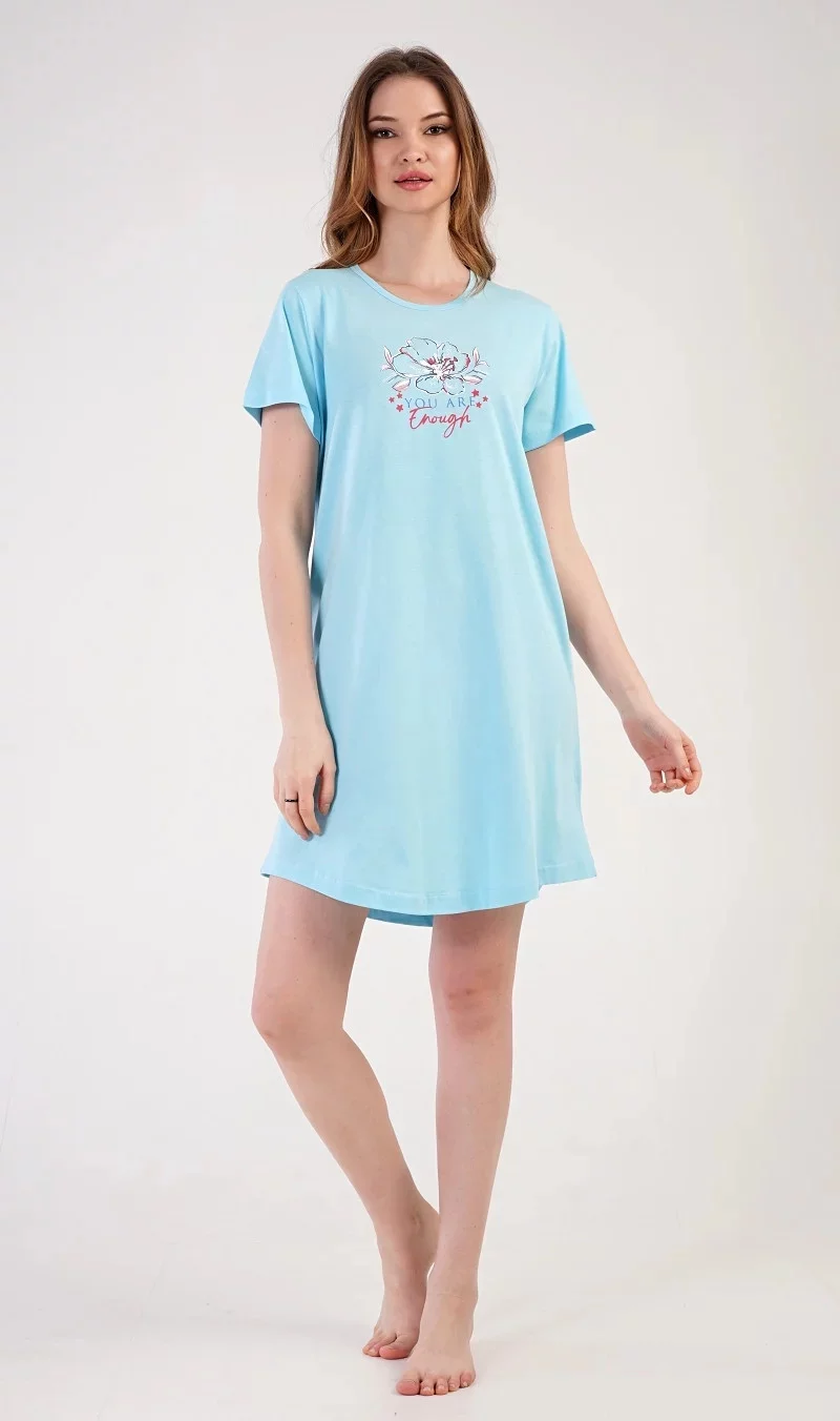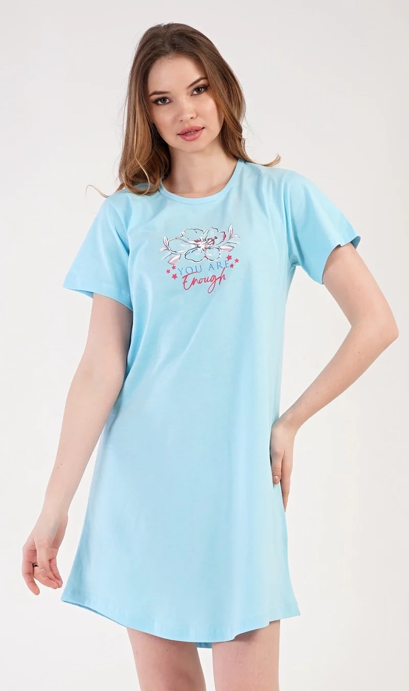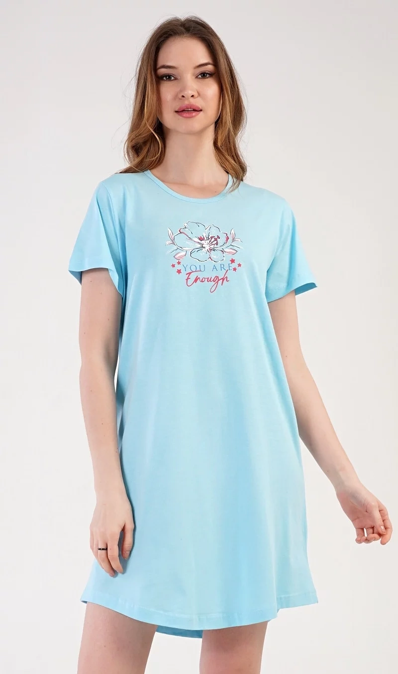 Dámska bavlnená nočná košeľa s krátkym rukávom Eliška. Nočná košeľa s okrúhlym výstrihom má na hrudi obrázok kvetu a malý nápis. Použitý bavlnený materiál je príjemný a poddajný na dotyk.