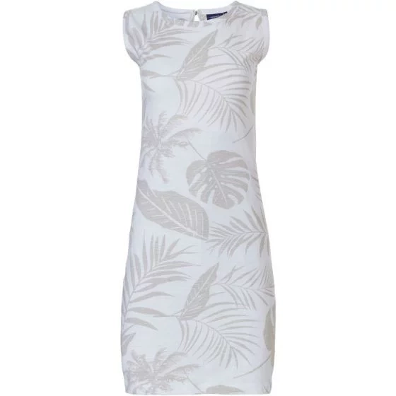 Dámska nočná košeľa bez rukávov od značky Pastunette s potlačou svetlo hnedých listov na bielom podklade.Nočná košeľa má okrúhly výstrih a dĺžku 95 centimetrov.
