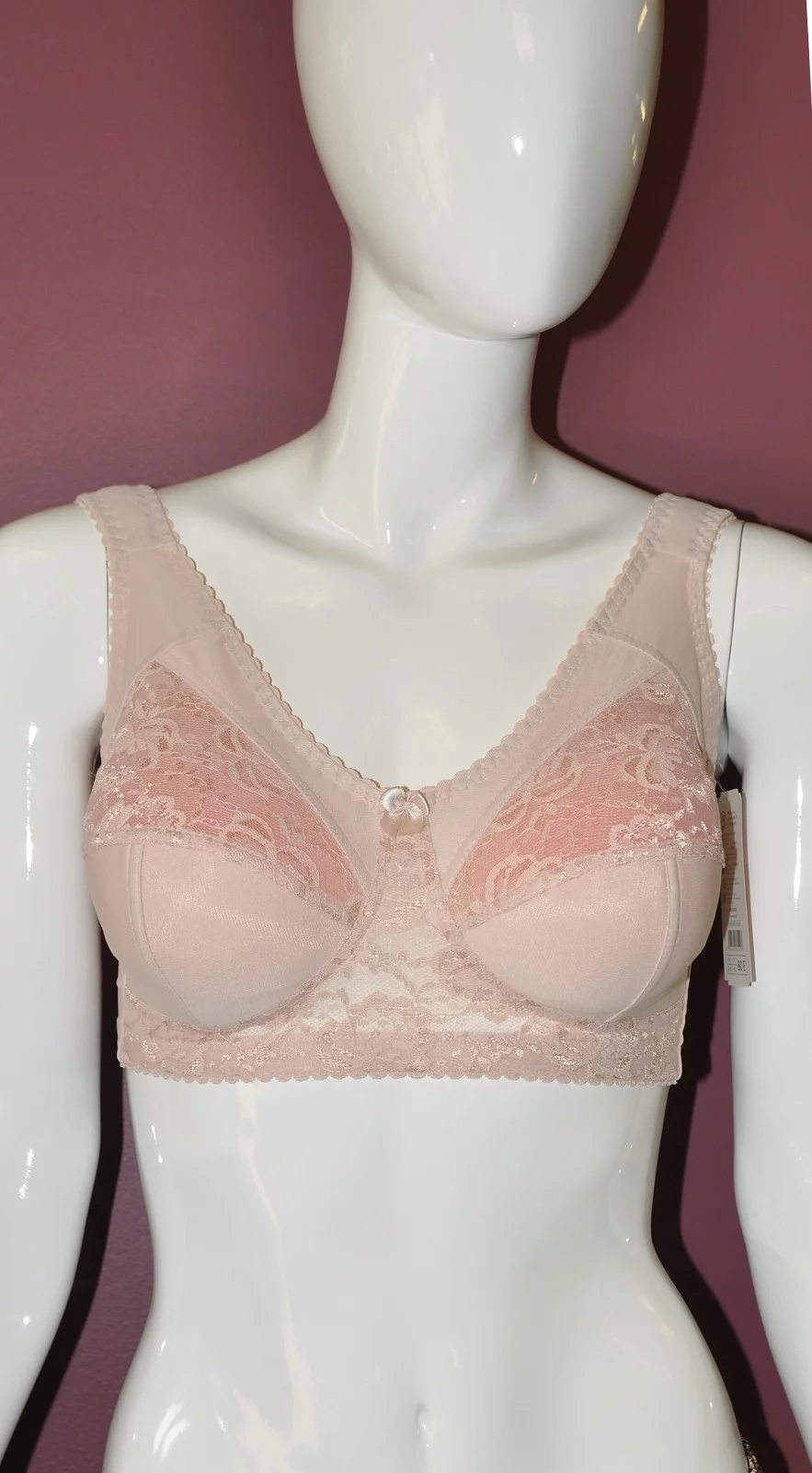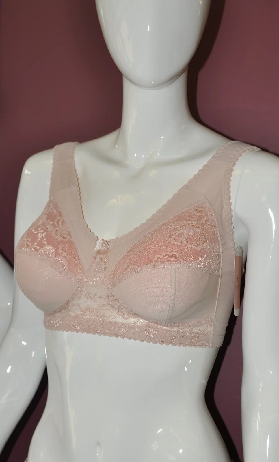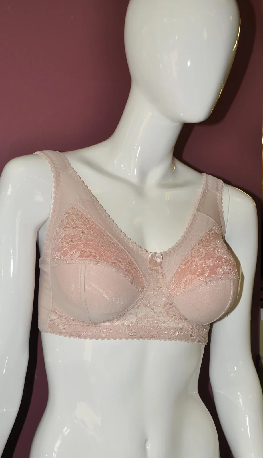 Mäkké košíčky nemajú kostice. Podprsenka je vyrobená zo sieťoviny a je do polovice podšitá tkaninou. Horná časť košíčkov je priesvitná a je ozdobená čipkou. V mieste spojenia košíčkov je saténová mašlička. Pohodlné široké ramienka sú zárukou komfortu pri nosení.