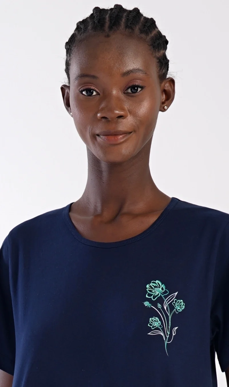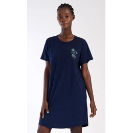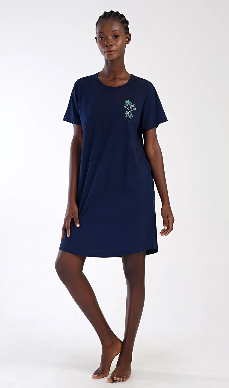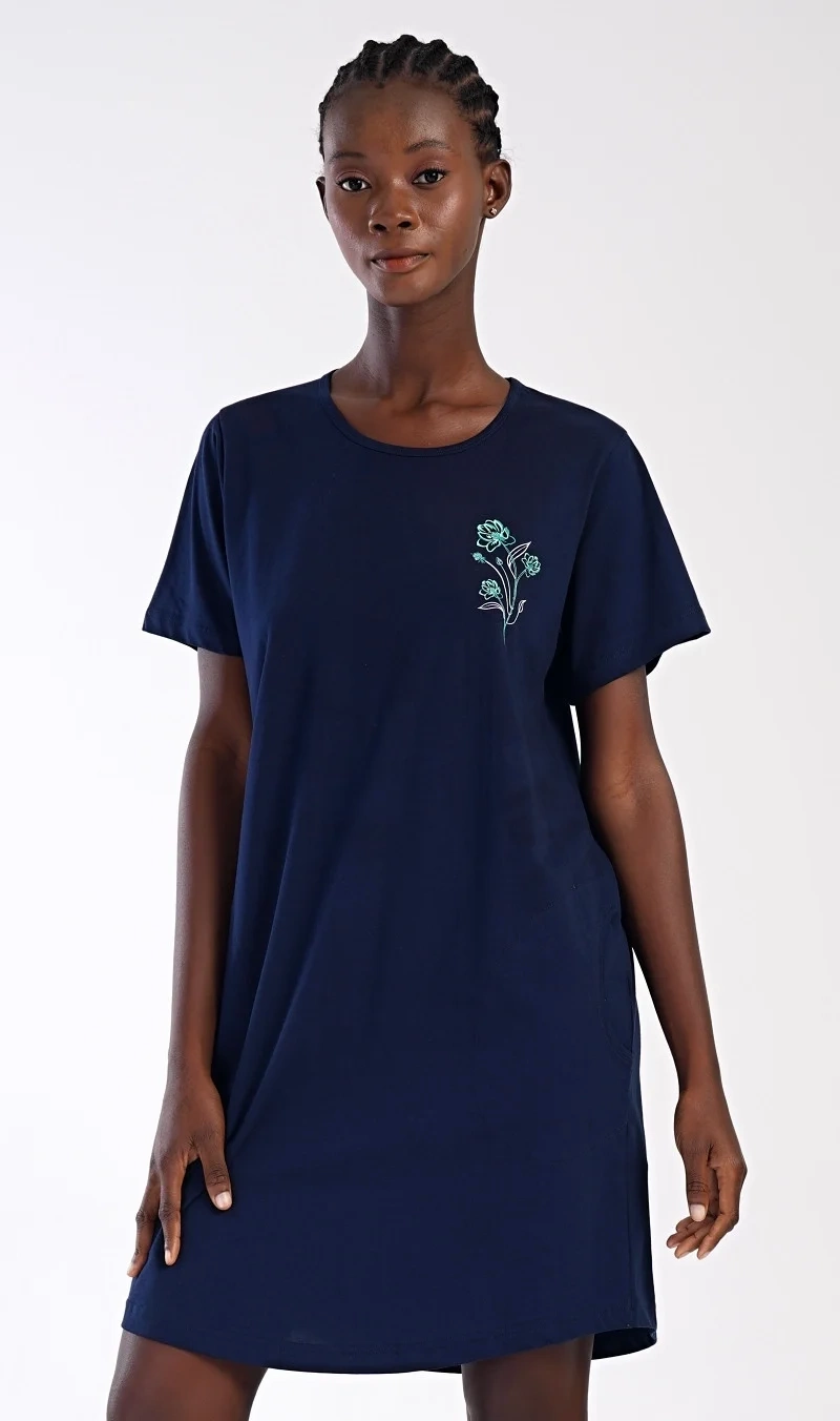Dámské bavlněné domácí šaty s krátkým rukávem Zuzka. Domácí jednobarevné šaty s kulatým výstřihem a kapsami zdobí na hrudi obrázek květů.