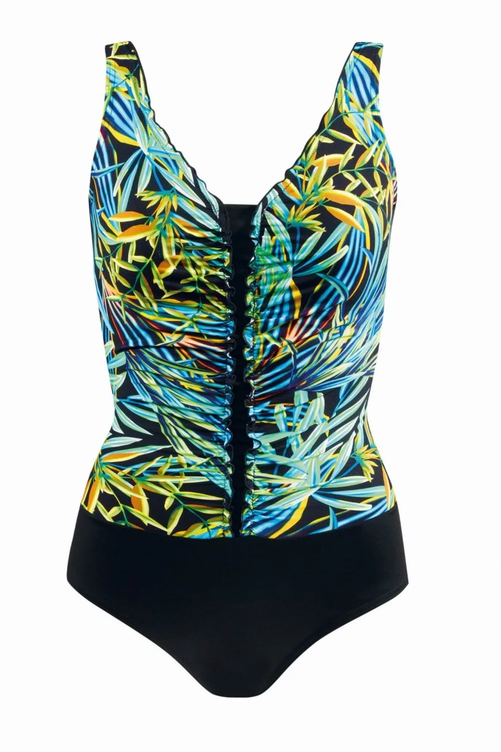 Jednodílné dámské plavky od italské značky Siélei. Plavky mají všitou jemnou podprsenkovou výztuž, která má ve spodní části pružnou gumu. Ramínka mají pevně všitá, nejsou délkově nastavitelná. Vzadu mají hlubší výstřih. Vpředu mají částečné přeložení zužující se směrem do boku s kruhovou aplikací v nejužším místě, plavky tak vizuálně zeštíhlí postavu. Tomu dopomůžou také zlaté svislé proužky a svislé řasení látky. Celé plavky jsou podšity. Materiálové složení: 83% polyester, 17% elastan.