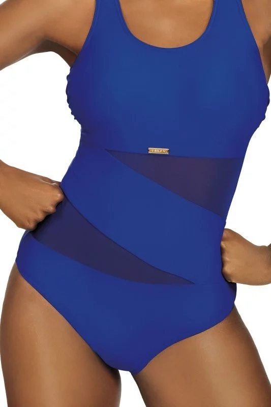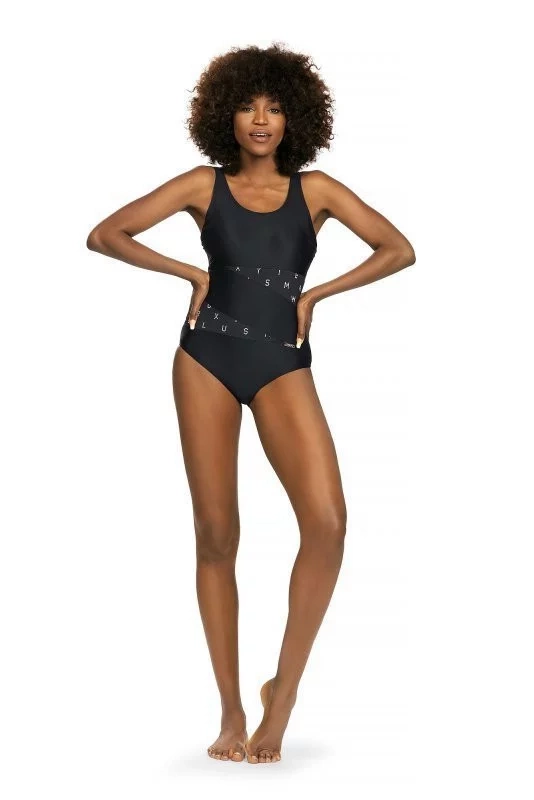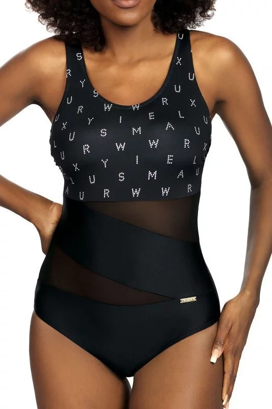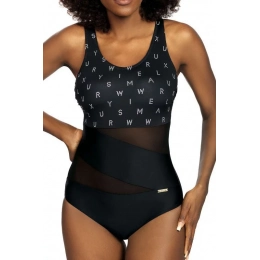Dámske jednodielne plavky S36, jednofarebné, čierne s bielymi bodkami v tylovej látke alebo čierne s bielymi písmenkami v tylovej látke.