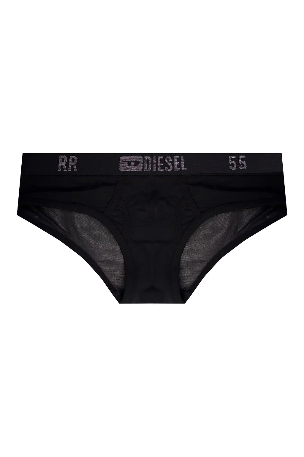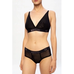 Čierne nohavičky od Diesel. Tento pár je vyrobený z polopriehľadnej sieťoviny a má elastický pás zdobený logom štítku vyšívaným striebornou lurexovou priadzou.