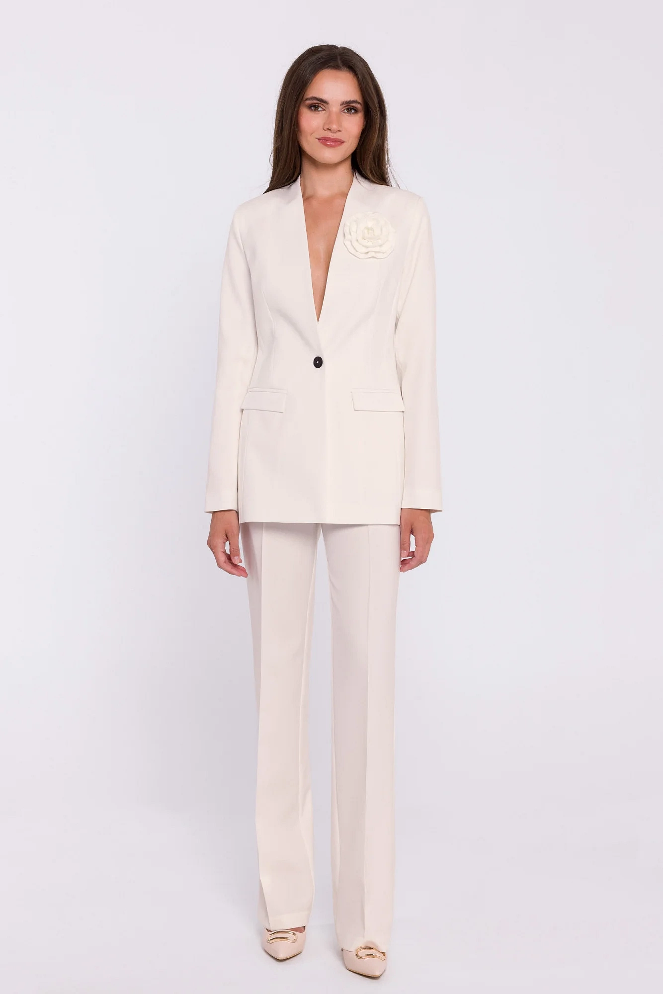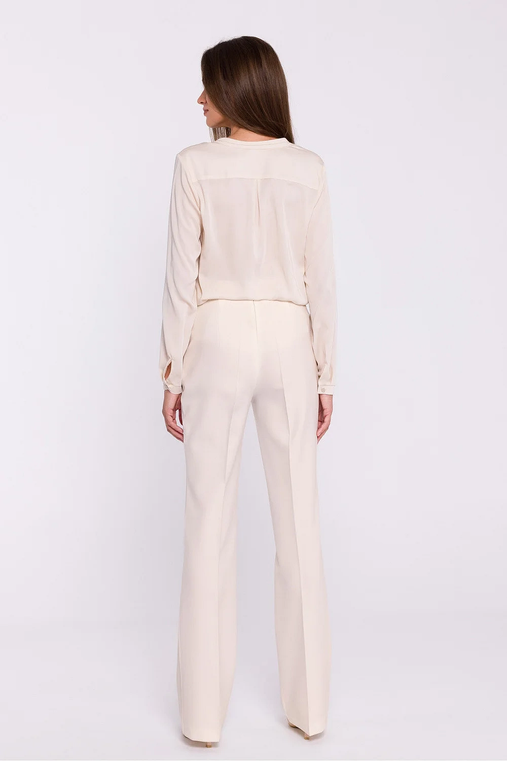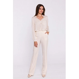 Elegantní dámské tkané kalhoty, které se vyznačují rozšířenými nohavicemi ve spodní části, jež dodávají siluetě lehkost a prodlužují nohy. Lisovaný okraj zdůrazňuje jejich klasický a rafinovaný charakter, ideální pro pracovní i formální příležitosti. Kalhoty mají vysoký náplet, který krásně zvýrazňuje pas, zatímco krytý zip v zadní části zajišťuje hladké a diskrétní zapínání. Jsou navrženy a ušity v Polsku a kombinují vynikající kvalitu zpracování s módním, ženským střihem.