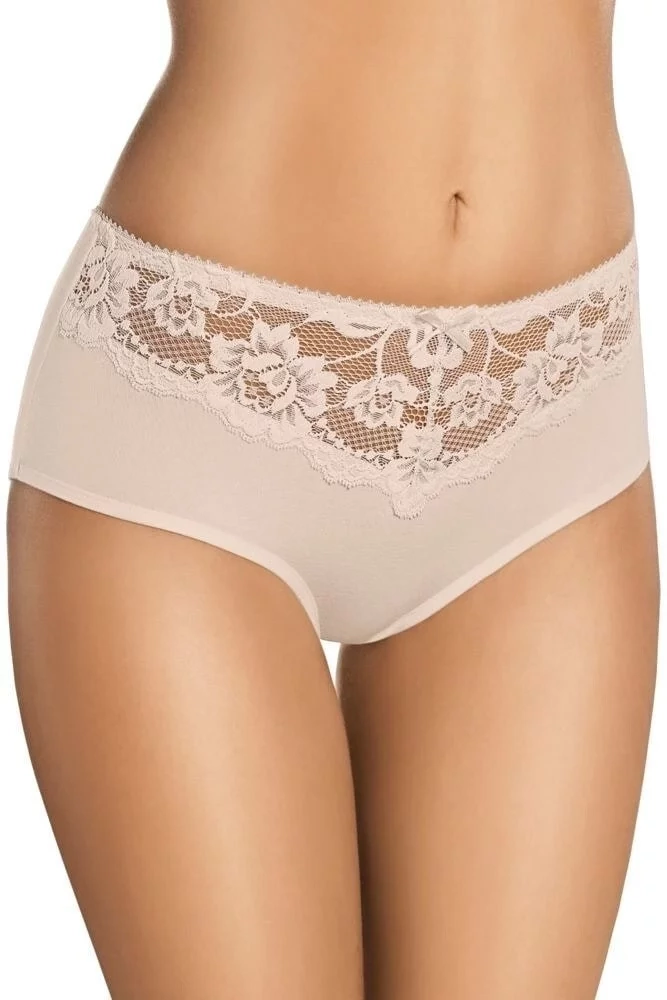 Elegantné, dámske nohavičky. Majú ľahko zvýšený pás. Vpredu je saténová mašlička. Pri hornom okraji krajkovej všivky. Model dokonale prilieha na telo a je pohodlný. Ušité z kvalitnej bavlny.