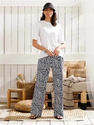 Plážové nohavice Pastunette s vreckami – elegantné tmavo modré spoločenské nohavice, nočné nohavice alebo plážové nohavice s bielou grafickou potlačou.Možno poznáte mäkké vlastnosti kvality Bamboo?S viskózou získate úplne rovnaké vlastnosti.Fantastický komfort a mäkkosť, ktorá je príjemná na tele, s fantastickými vlastnosťami na reguláciu teploty a odvodu potu.Mäkký džersej vyrobený z rastlinných a drevených vlákien