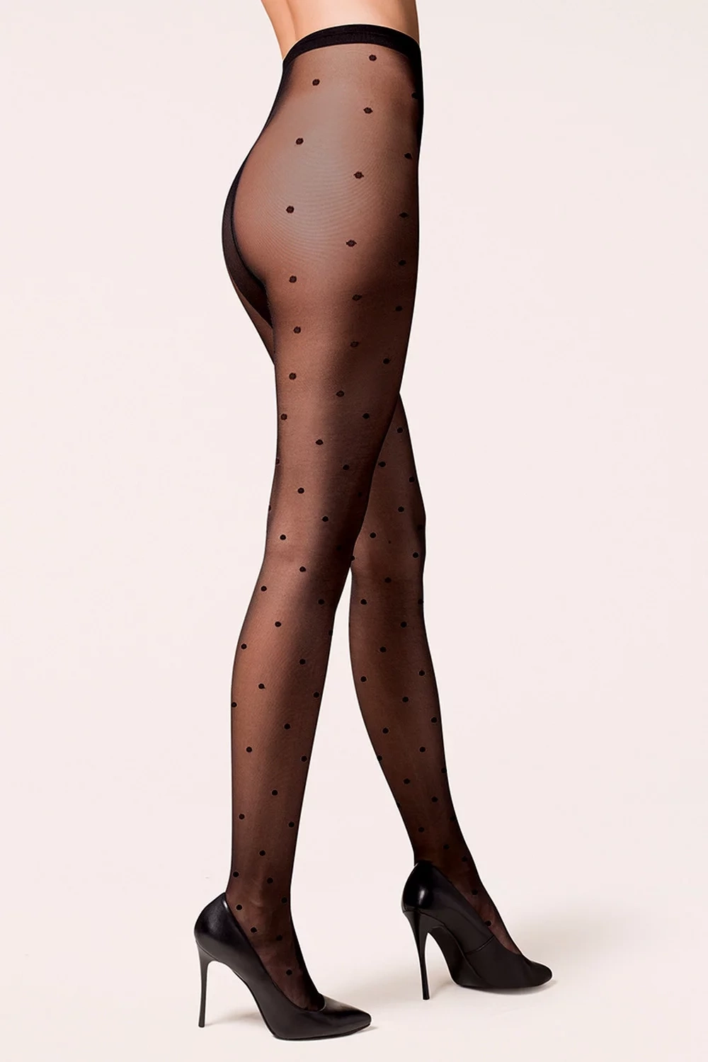 Dámske pančuchové nohavice s obsahom vlákna typu Lycra. Dámske celovzorované pančuchy zdobia vzor jemného bodku. Pančuchové nohavice sú šité plochým švom, bez zosilneného sedu a vyznačenej špice.