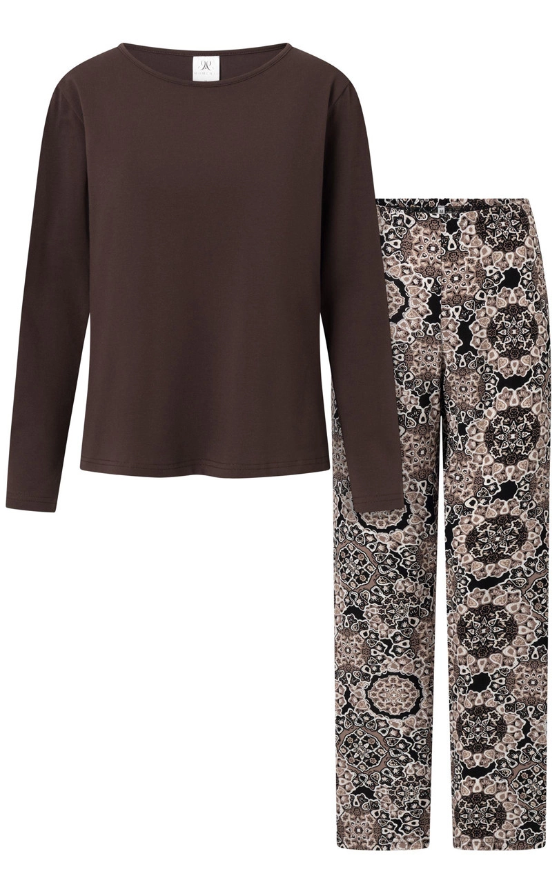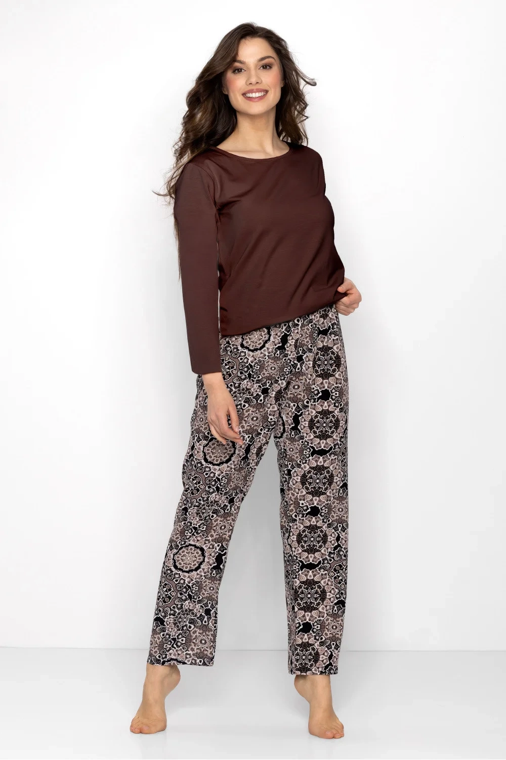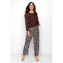 Dámský pyžamový set, který kombinuje eleganci s pohodlím. Tričko s dlouhým rukávem a polokruhovým výstřihem v subtilní ženské stylu se skvěle hodí nejen jako spánek, ale také jako stylový domácí oděv. Vyrobeno z měkkého, prodyšného materiálu s květovanou strukturou, poskytuje pohodlí po celý den. Kalhoty s dlouhými nohavicemi a volným, pohodlným střihem jsou ideálním doplňkem setu. Díky elastickému pásku v pase se přizpůsobí postavě a nabídnou volnost pohybu. Pyžamo se vyznačuje decentní barevností a vysokou kvalitou materiálu, což mu dodává elegantní vzhled. Je to skvělá volba pro ženy, které ocení pohodlí a styl v domácím prostředí. Složení: Top: 92% bavlna, 8% elastan Dolní část: 100% viskóza