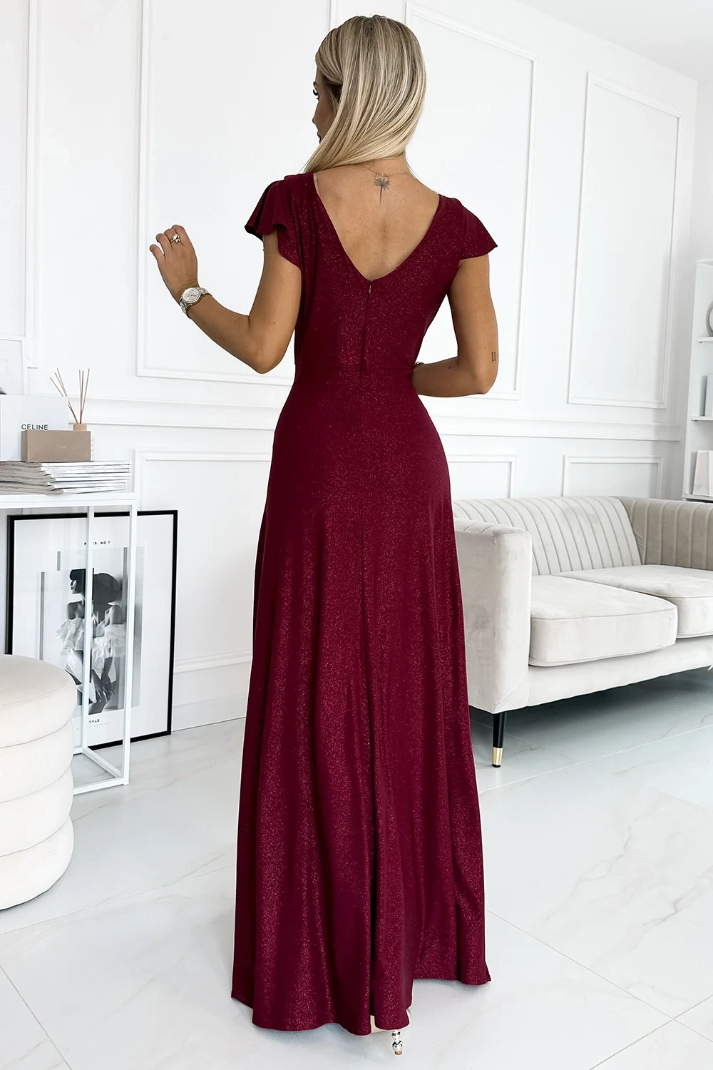 411-8 CRYSTAL połyskująca długa suknia z dekoltem - BORDOWA XL