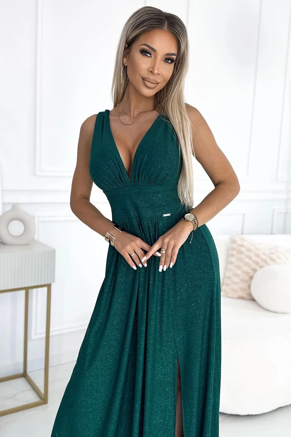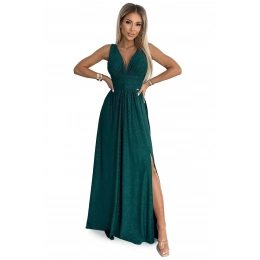 Dámské šaty 490-3 SUSAN NUMOCO - zelená barva - otevřený výstřih - prošívání v pase - rozparek - elastický materiál se třpytkami - ideální na svatby, plesyMateriálové složení: 95% polyester + 5% elastan