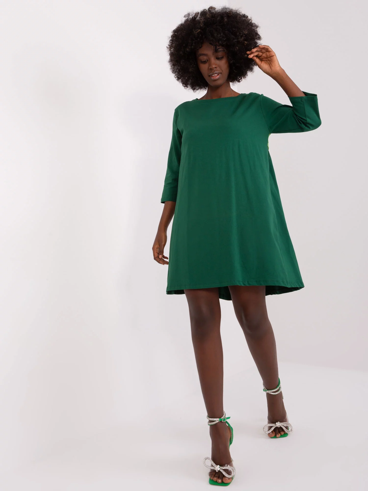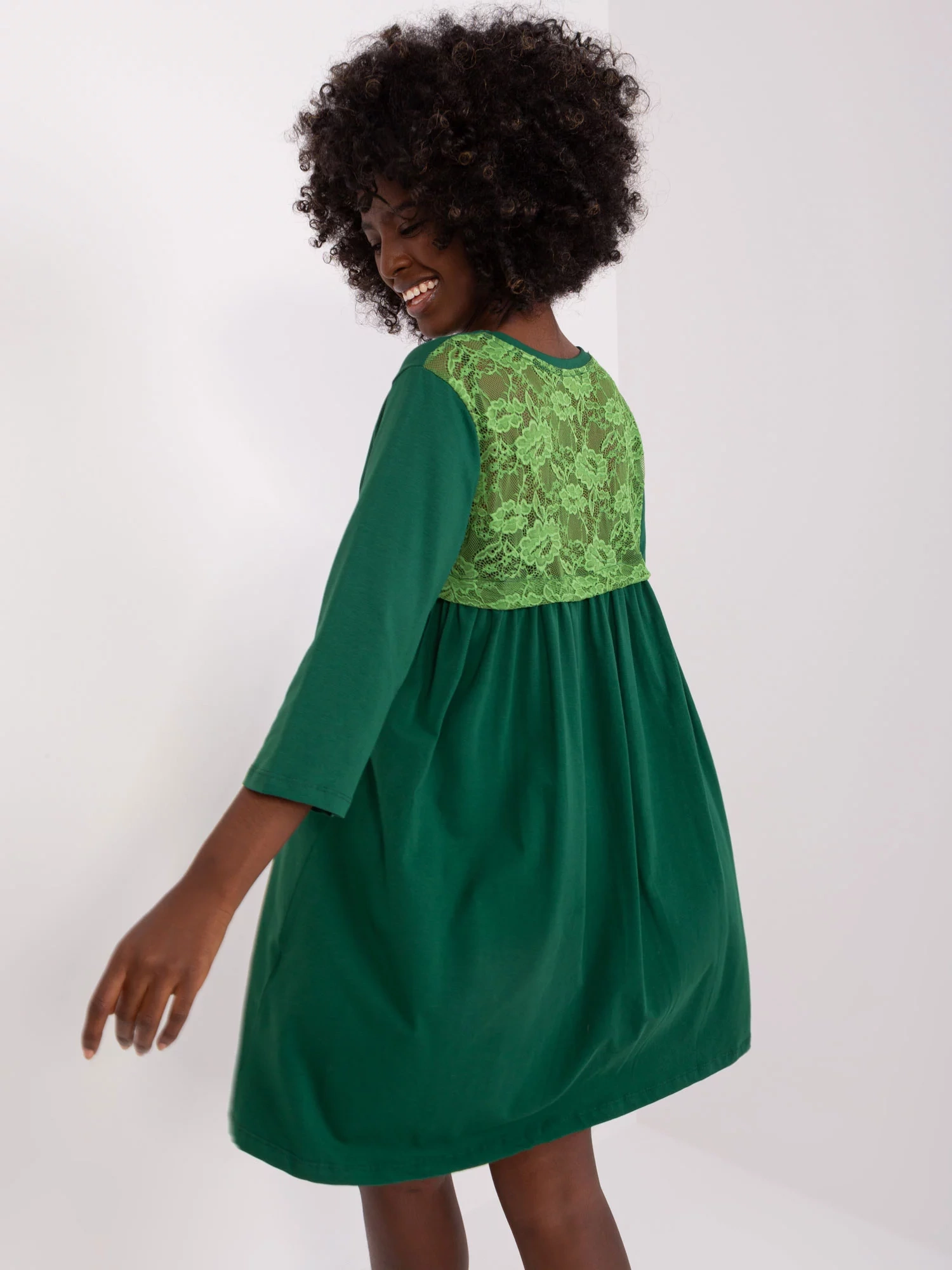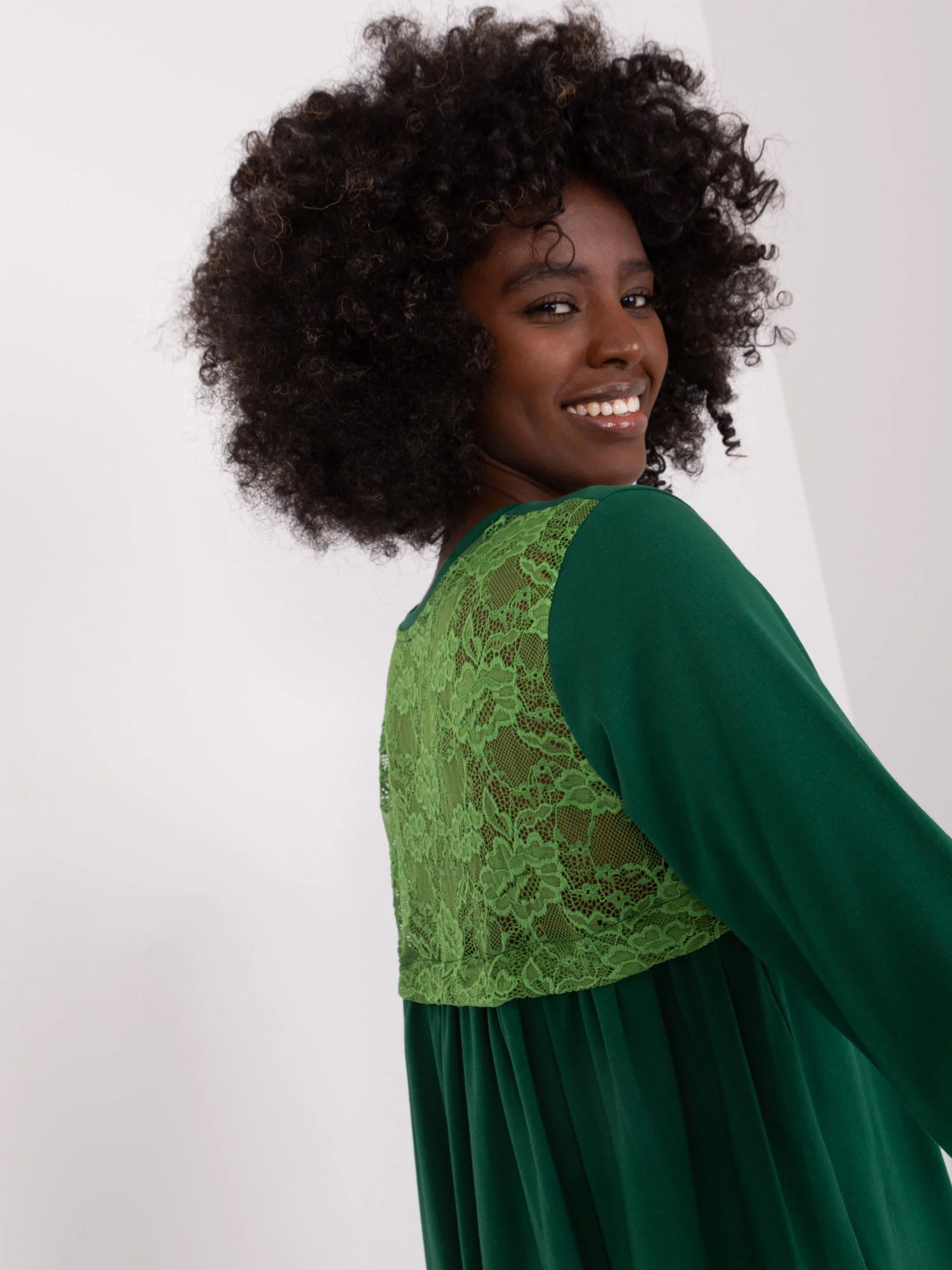 Modelka má na sebe veľkosť S/M. Rozmery modelky: výška 168 cm, prsia 82 cm, pás 62 cm, boky 93 cm.