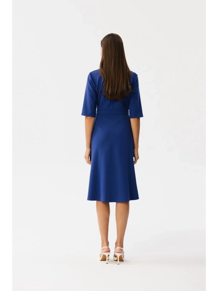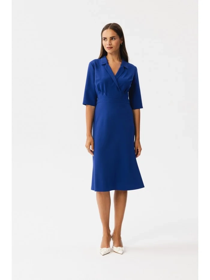 DETAILY PRODUKTU: tkaná látka zavinovacie šaty s golierom dĺžka pod kolená a šikmým strihom sukne 3/4 rukávy skrytý zips na chrbte bez podšívky naša modelka je vysoká 174 cm a nosí veľkosť S navrhnuté a vyrobené v Poľsku