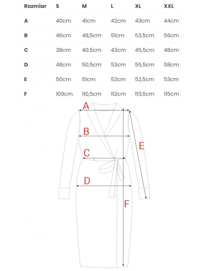 PODROBNOSTI O PRODUKTE Výstrih: zavinovací výstrih do V Golier: šálový golier Rukávy: 7/8 dĺžky s vyhrnutými manžetami Pas: zvýraznený pásikom Zapínanie: zaväzovanie v páse Vrecká: žiadne Podšívka: čiastočne podšitá Model: S415 Navrhnuté a vyrobené v Polsku STRIH Štýl: zavinovacie šaty Tvar: vypasovaný vršok, rovná sukňa s miernym uvoľnením Dĺžka: pod kolená