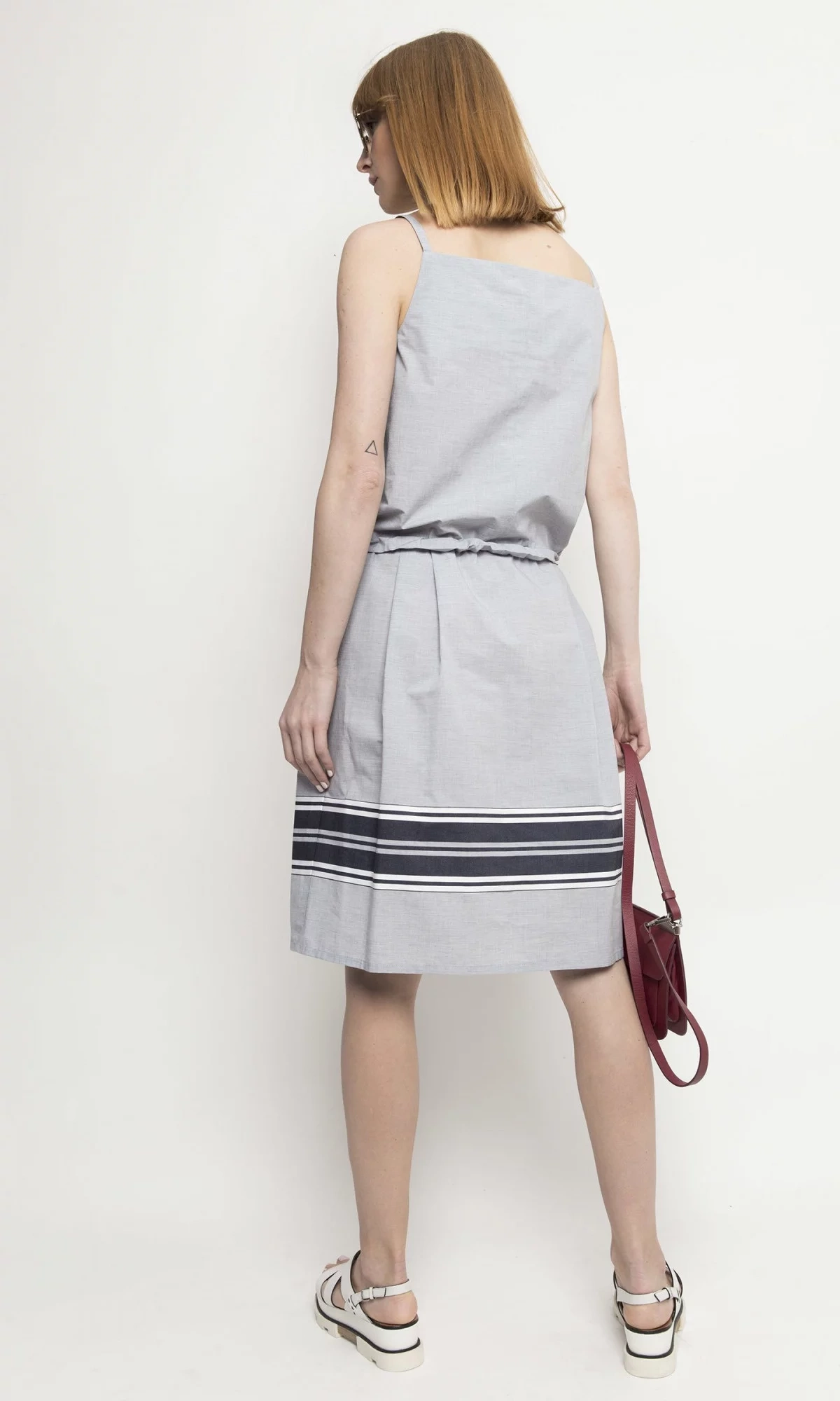 Svetlosivé šaty s tmavo modrými a bielymi ozdobnými prvkami.100% bavlna Pokyny pre starostlivosť: Pokyny pre pranie: Ručné pranie alebo profesionálne chemické čistenie Kolekcia: Jar/Leto Farba: Sivá Pohlavie: Ženské