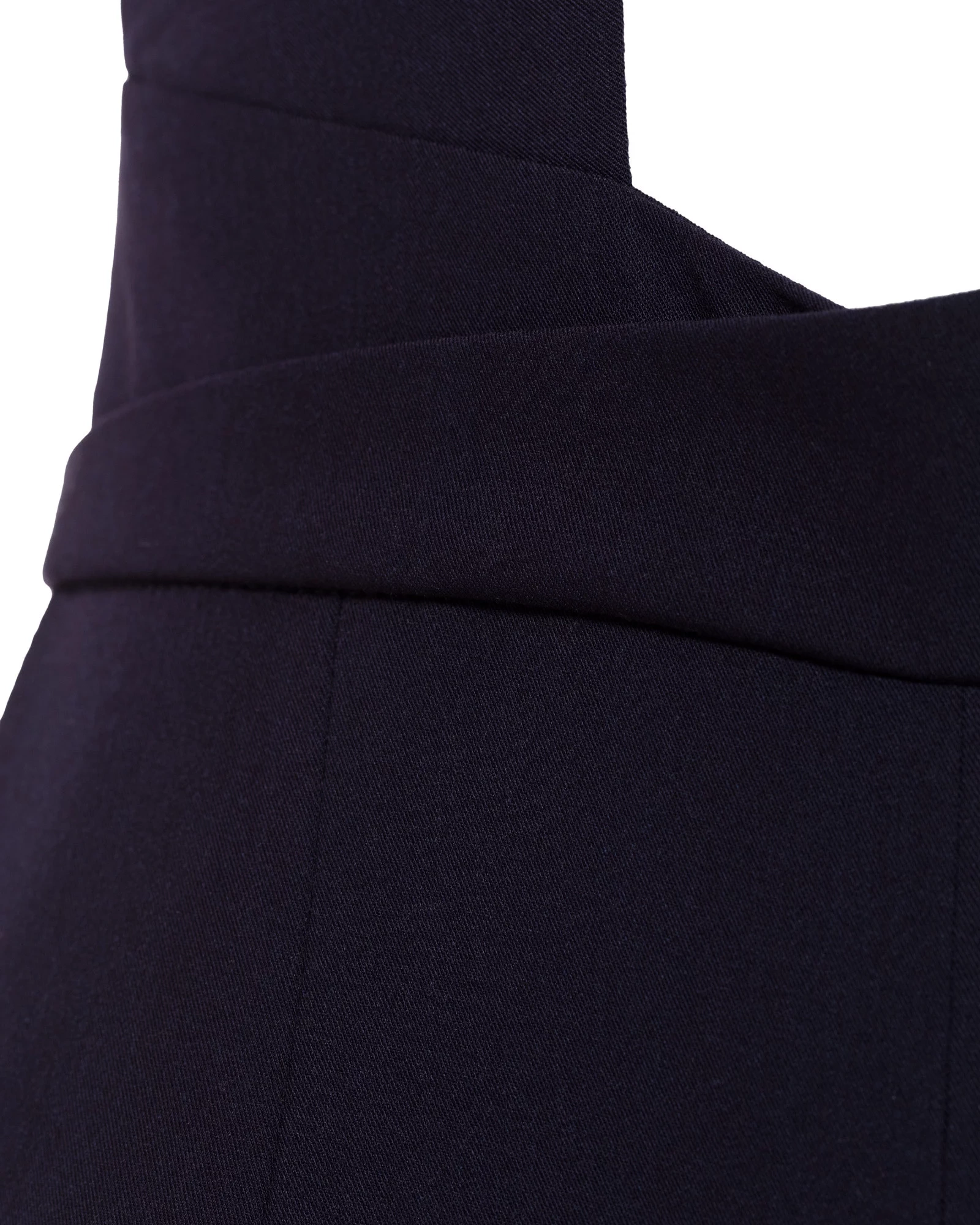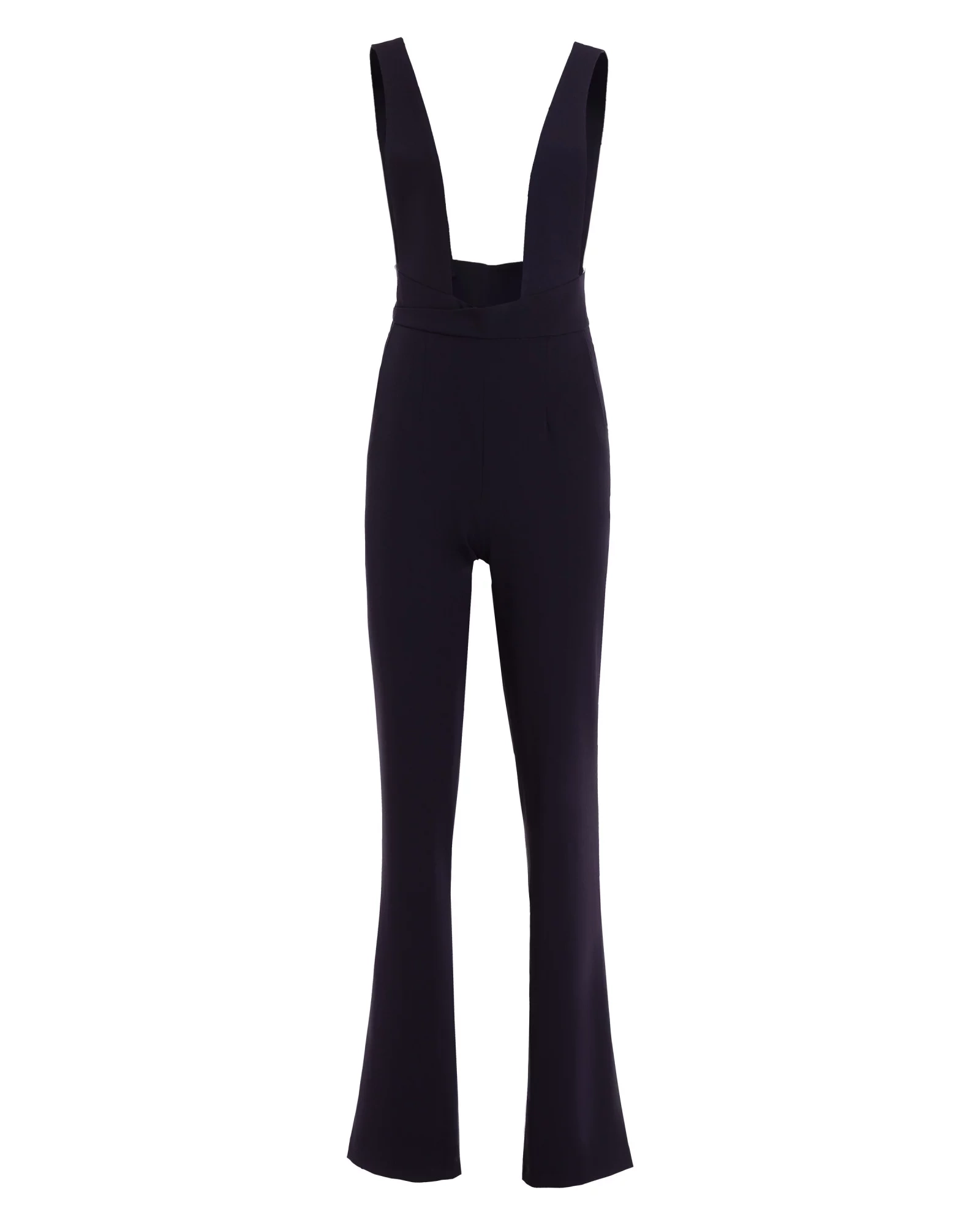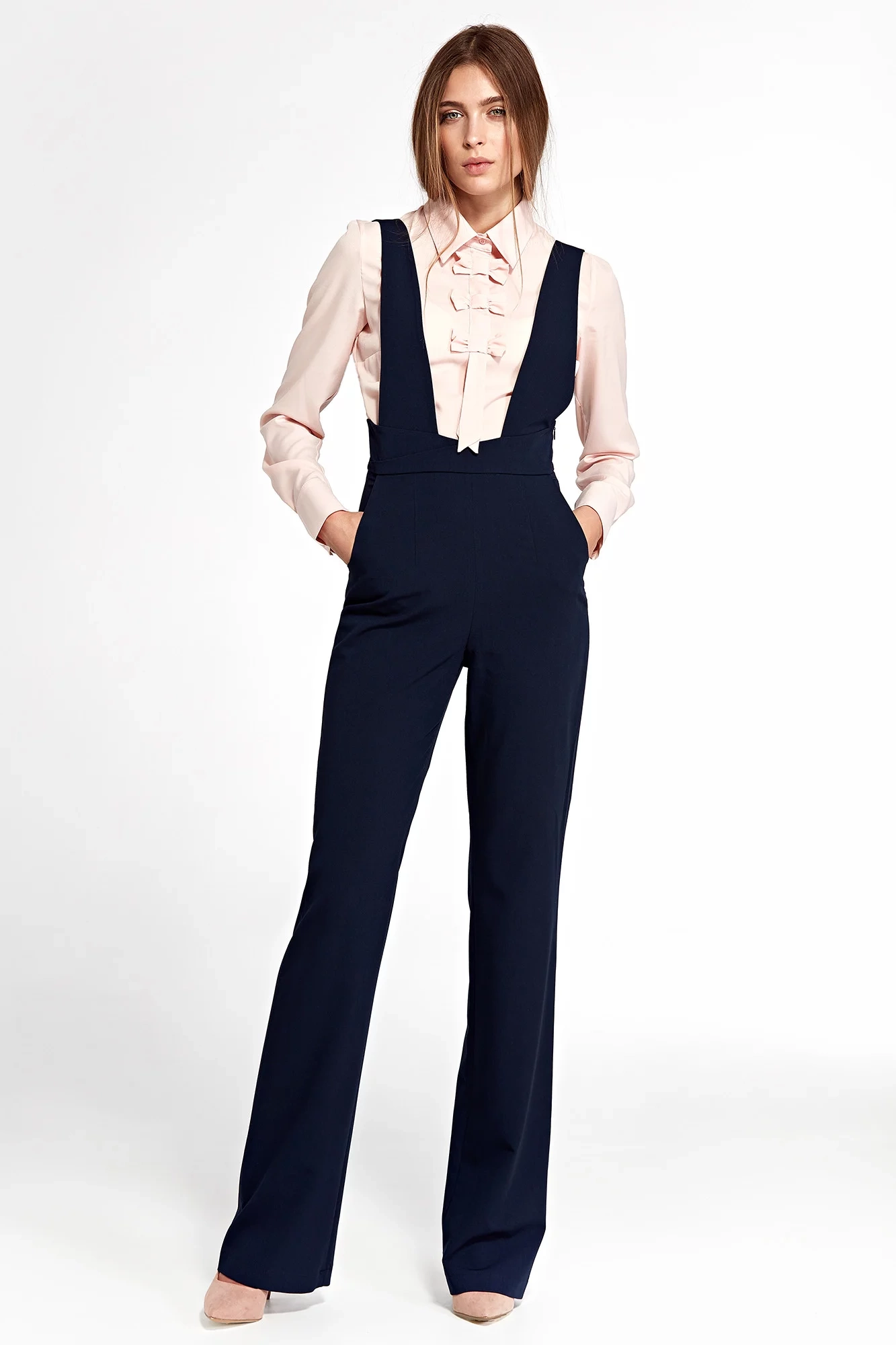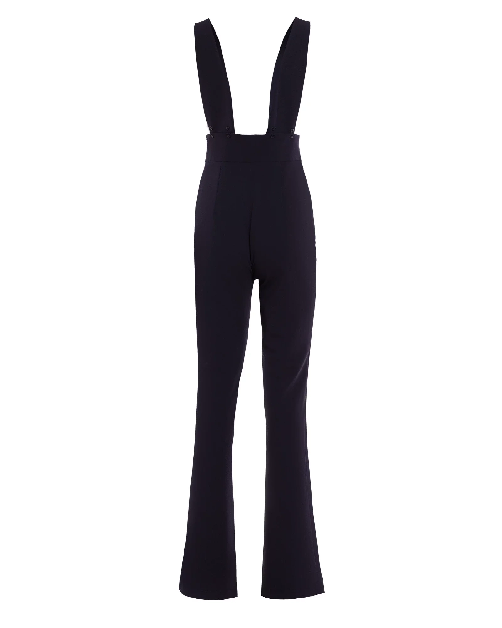 Overal s vysokým pásom, širokými ramienkami, zapínaním na gombíky na chrbte, všitým zavinovacím pásikom a zipsom na boku.