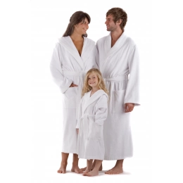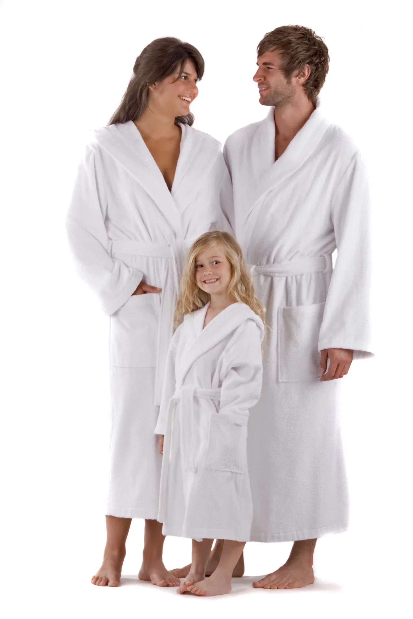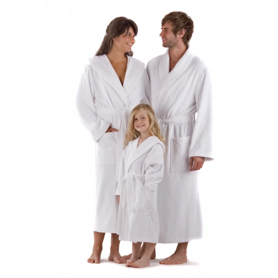 Dlhý biely župan so šálovým golierom je dostupný ako unisex model av tejto kolekcii Sauna je možné zakúpiť župan aj v prevedení župan s kapucňou, kimono župan strih a aj ako detský župan s kapucňou. Môžete tak zladiť celú rodinu.