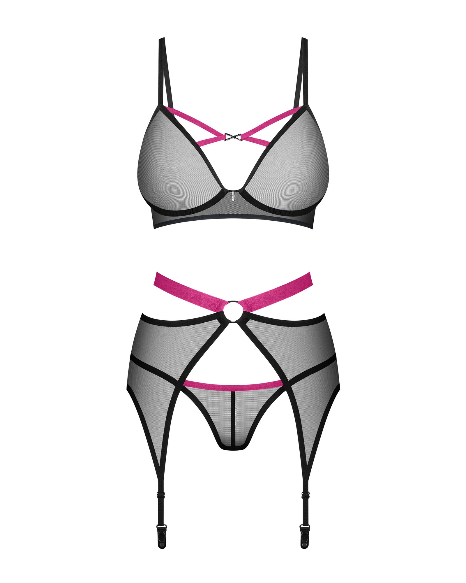 Trojdielna súprava z kolekcie Novenes elektrizuje a ohromuje svojim zmyselným dizajnom! Skladá sa z podprsenky, táng a podväzkového pásu. Je vyrobená z čiernej priesvitnej látky, zdobenej fialovými akcentmi a lesklými detailmi. Jej perfektný strih zaručuje zvodný vzhľad a pohodlie pri nosení. Presvedčte sa sami, aká mocná môže byť!