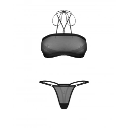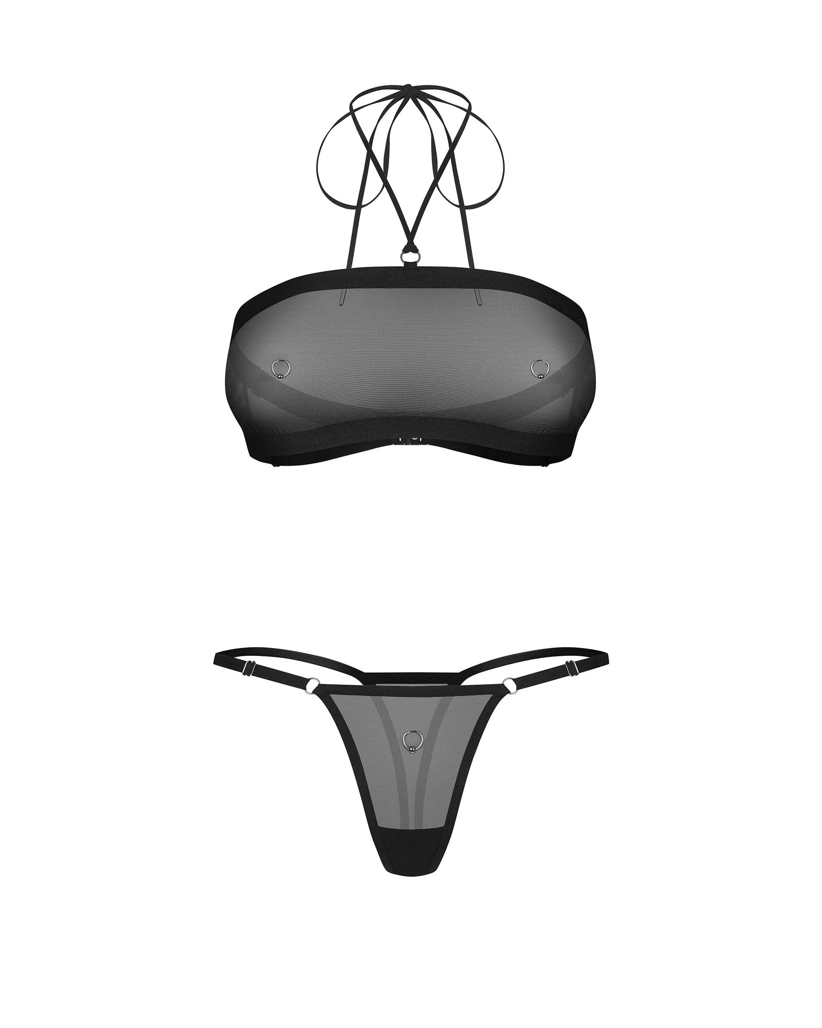 Top a tangá z priehľadnej sieťoviny v modernom minimalistickom štýle. Elastický materiál sa jemne prispôsobí telu, zatiaľ čo široký podprsný pás stabilizuje strih a zdôrazňuje siluetu. Jemné kovové detaily na prednej strane dodávajú designu ľahko provokatívny charakter. Perfektný set pre ženy, ktoré rady zdôrazňujú svoj individuálny štýl.