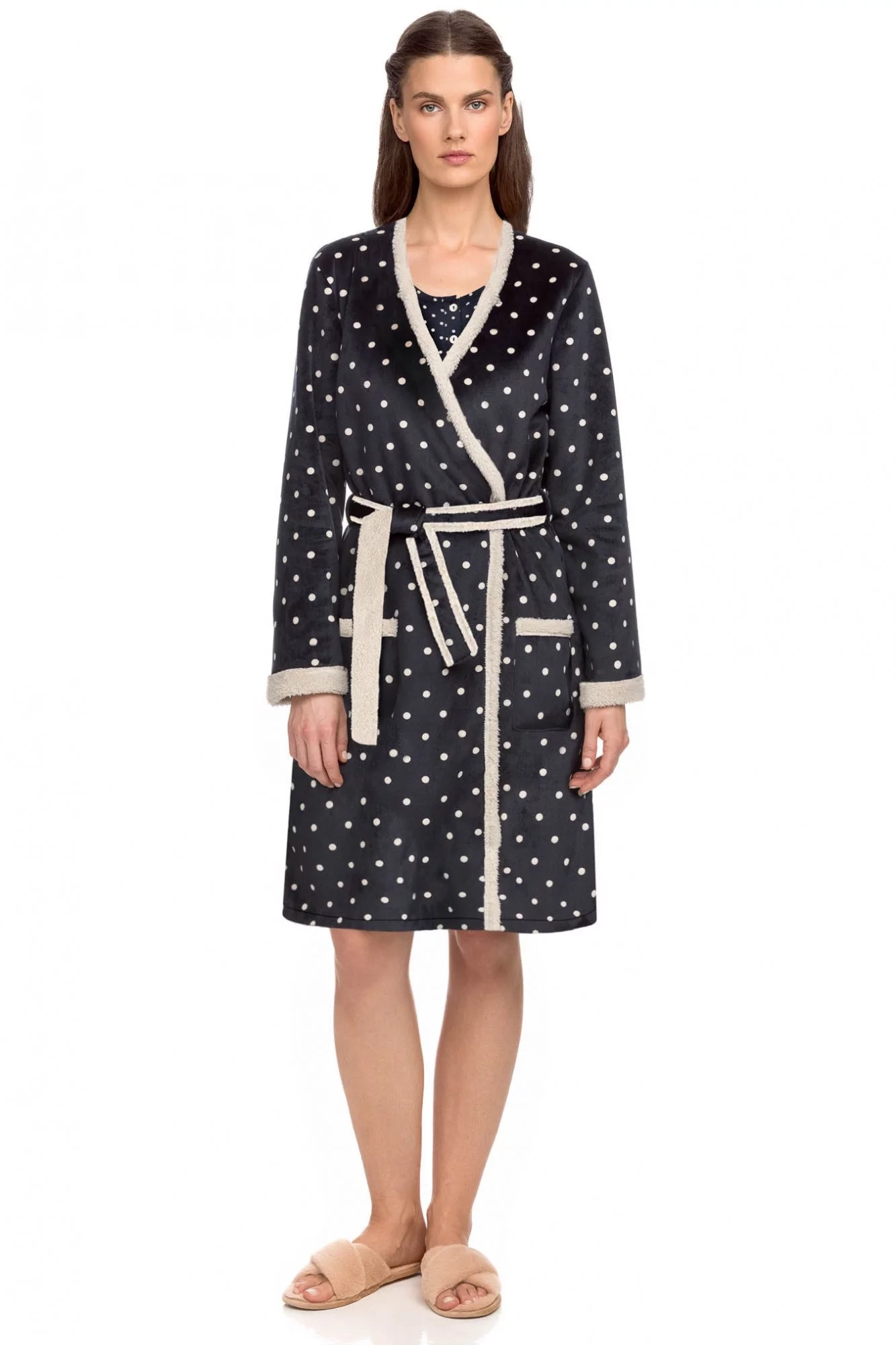 Pohodlný dámsky župan pre krásne chvíle a pocit pohodlia. Tento župan s potlačou bodiek, dlhým rukávom a zavinovacím strihom je vyrobený z ľahkého a hrejivého polyesterového vlákna, ktoré je objemné, mäkké a príjemné na dotyk, dobre udržuje telesnú teplotu a rýchlo schne.