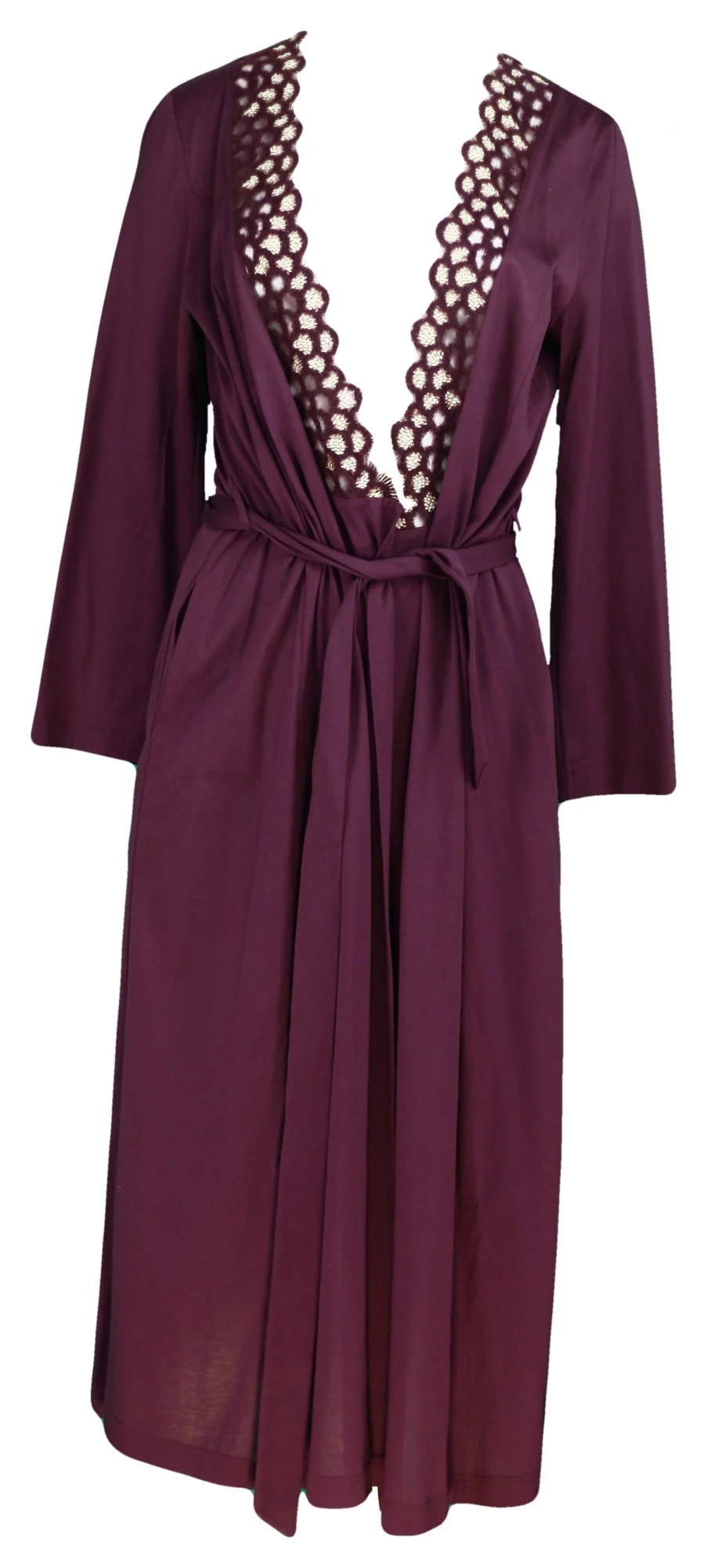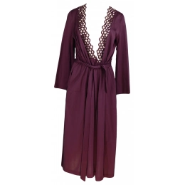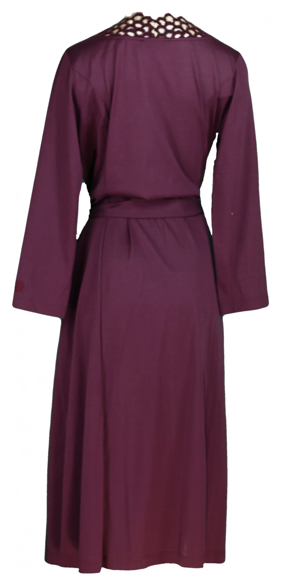 Dámsky župan 3024053 - Féraud, je luxusný župan vínovej farby lemovaný vyšívanou čipkou v zavinovacom štýle. Materiál - 100% bavlna