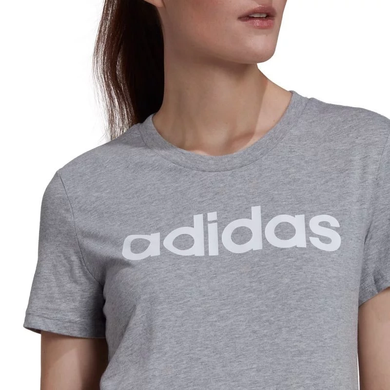 - Dámske šedé tričko adidas s veľkým tlačeným logom na hrudi a zaobleným výstrihom.