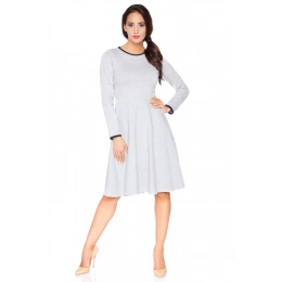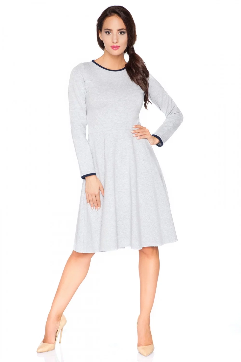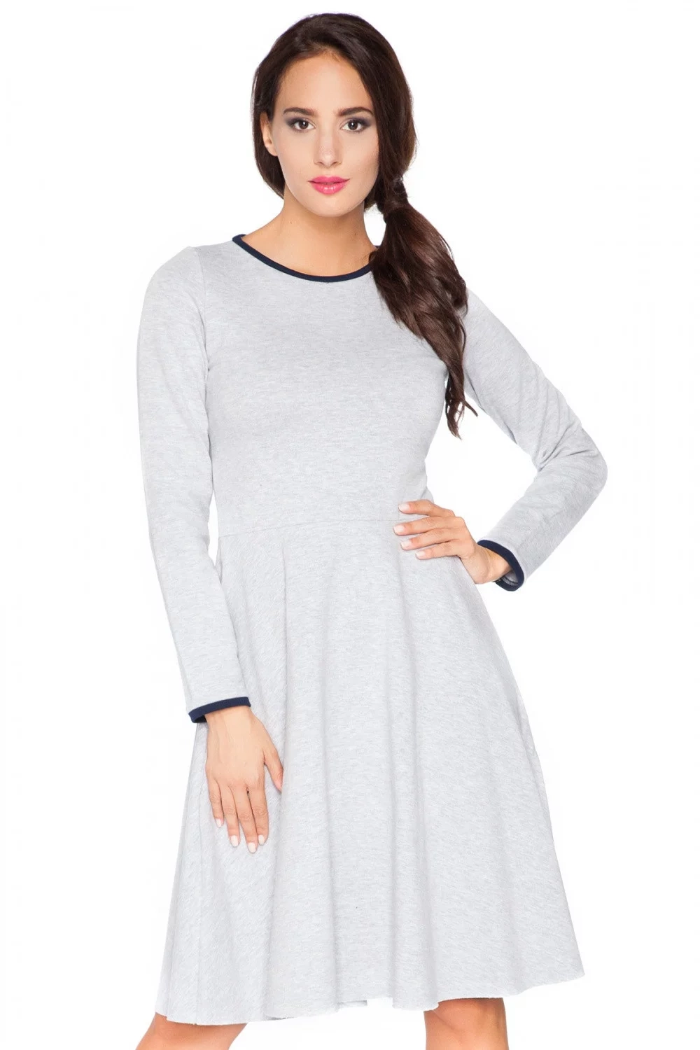 Šaty z pletenej mikiny, v páse prestrihnuté. Výstrih a rukávy zakončené lemovaním v kontrastnej farbe. Spodná časť šiat je rozšírená a ponechaná v surovom stave.