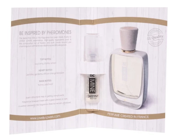 Zvodná dámska vôňa zo série BEMINE vytvorená vo Francúzsku. Vďaka skúsenostiam značky LOVELY LOVERS bol použitý molekulárny vzorec IL-Molecules (INTENSE LOVE MOLECULES), ktorý je výsledkom výskumu viac ako 300 vonných atraktantov v rôznych pomeroch. Boli vybrané tie, ktoré majú najväčší vplyv na opačné pohlavie, čím sa z komplexu vonných olejov vytiahlo maximum. Vzorec IL-Molecules bol zdokonalený tak, aby sa synergicky dopĺňal s vôňou ženskej pokožky a vytvoril tak jedinečný celok. Zloženie BEMINE DESTINY pre ženy je jedinečnou kombináciou kvetinových tónov, prepletených so šťavnatým ovocím na báze rastlinných olejov a jemného medového podkresu. Najvyššia koncentrácia a kvalita použitých ingrediencií vám umožní vytvoriť zvodnú auru plnú ženských vibrácií a flirtujúcu eleganciu.