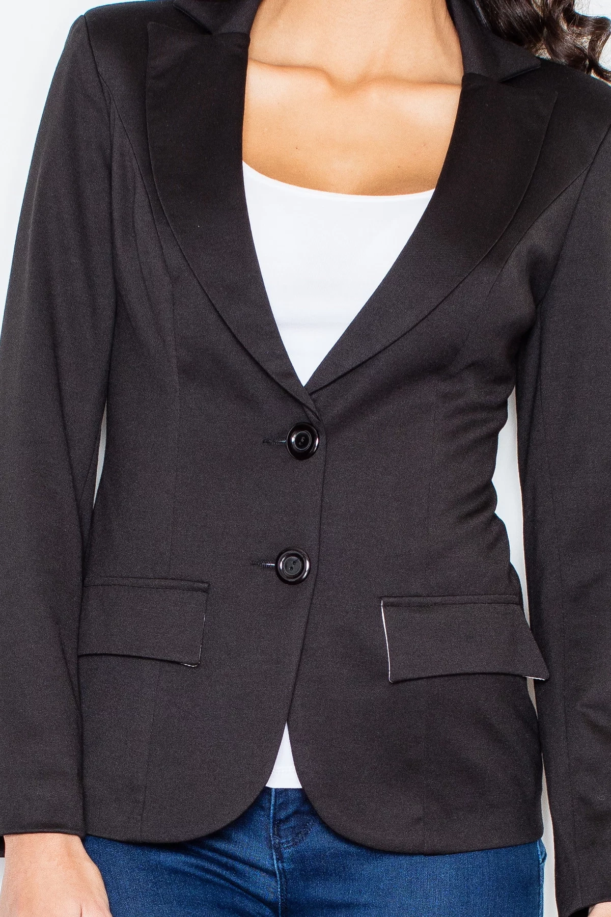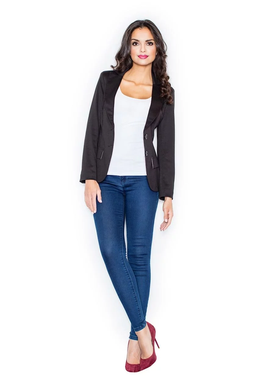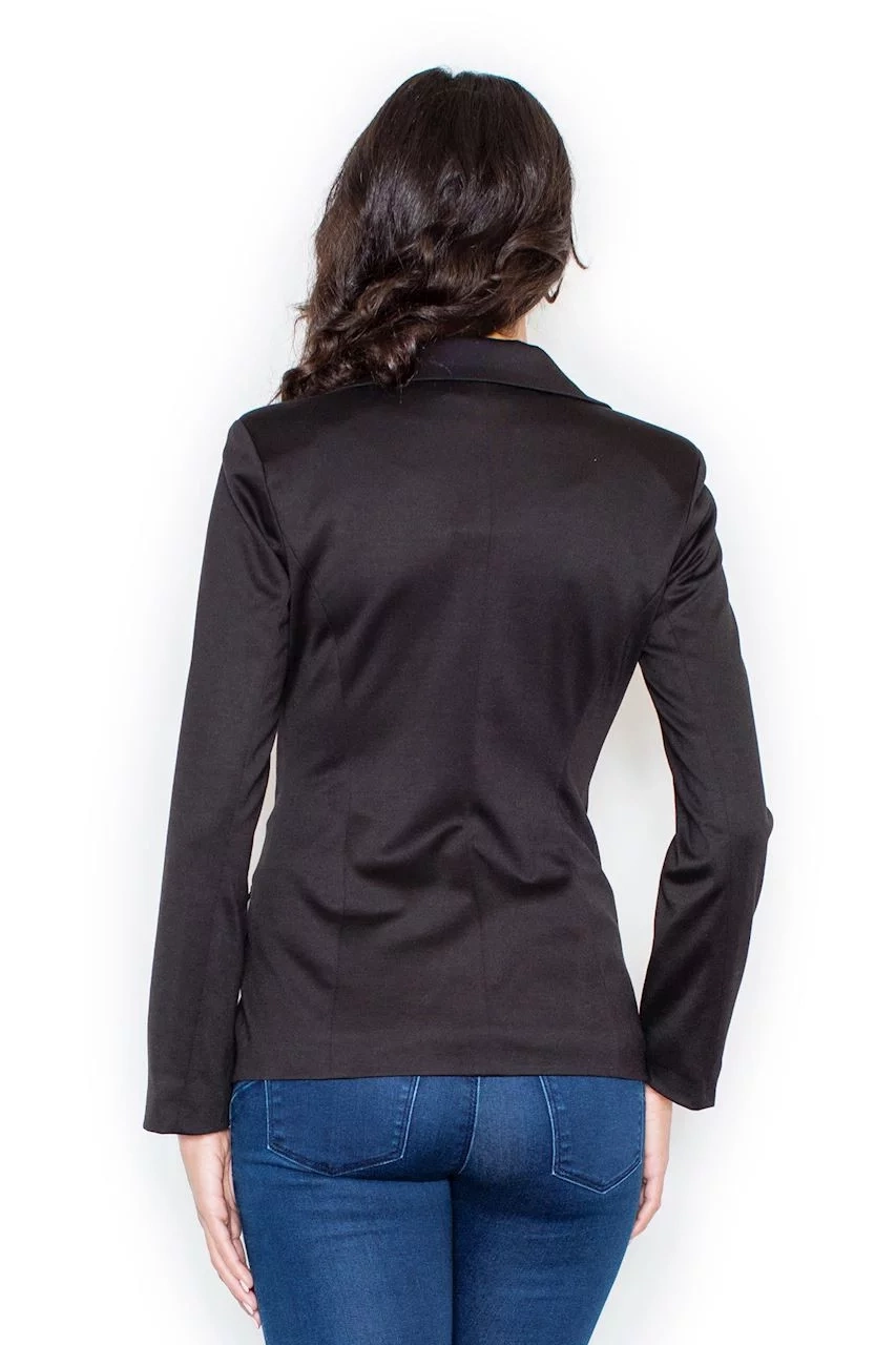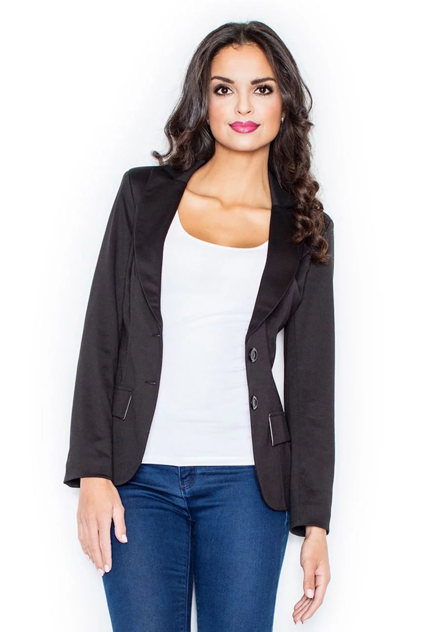 Dámske mäkké sako s dlhým rukávom, dĺžka cez boky. Podšité. Zapínanie na dva gombíky. Na prednom diele našité chlopne - imitácia vreciek.