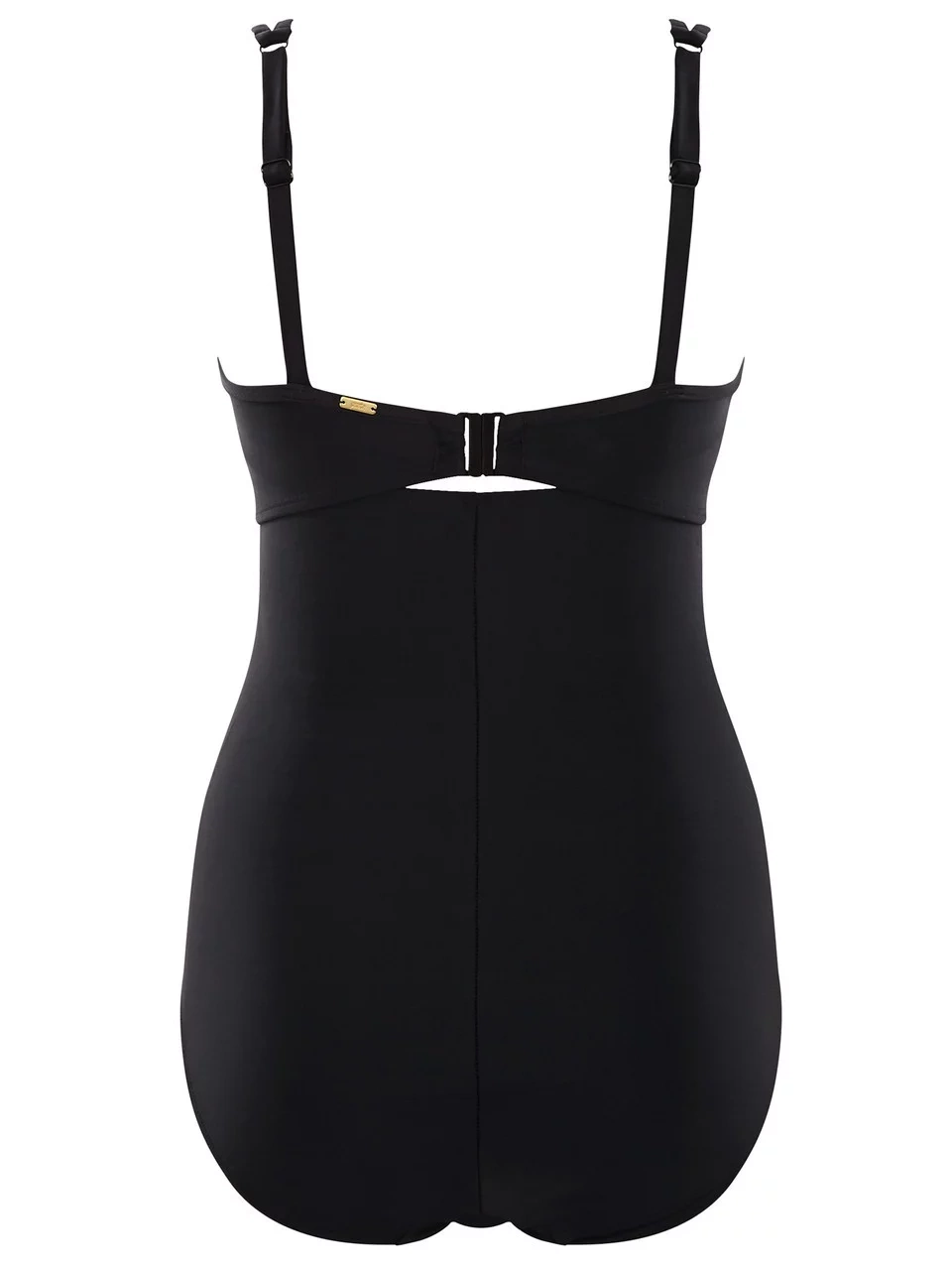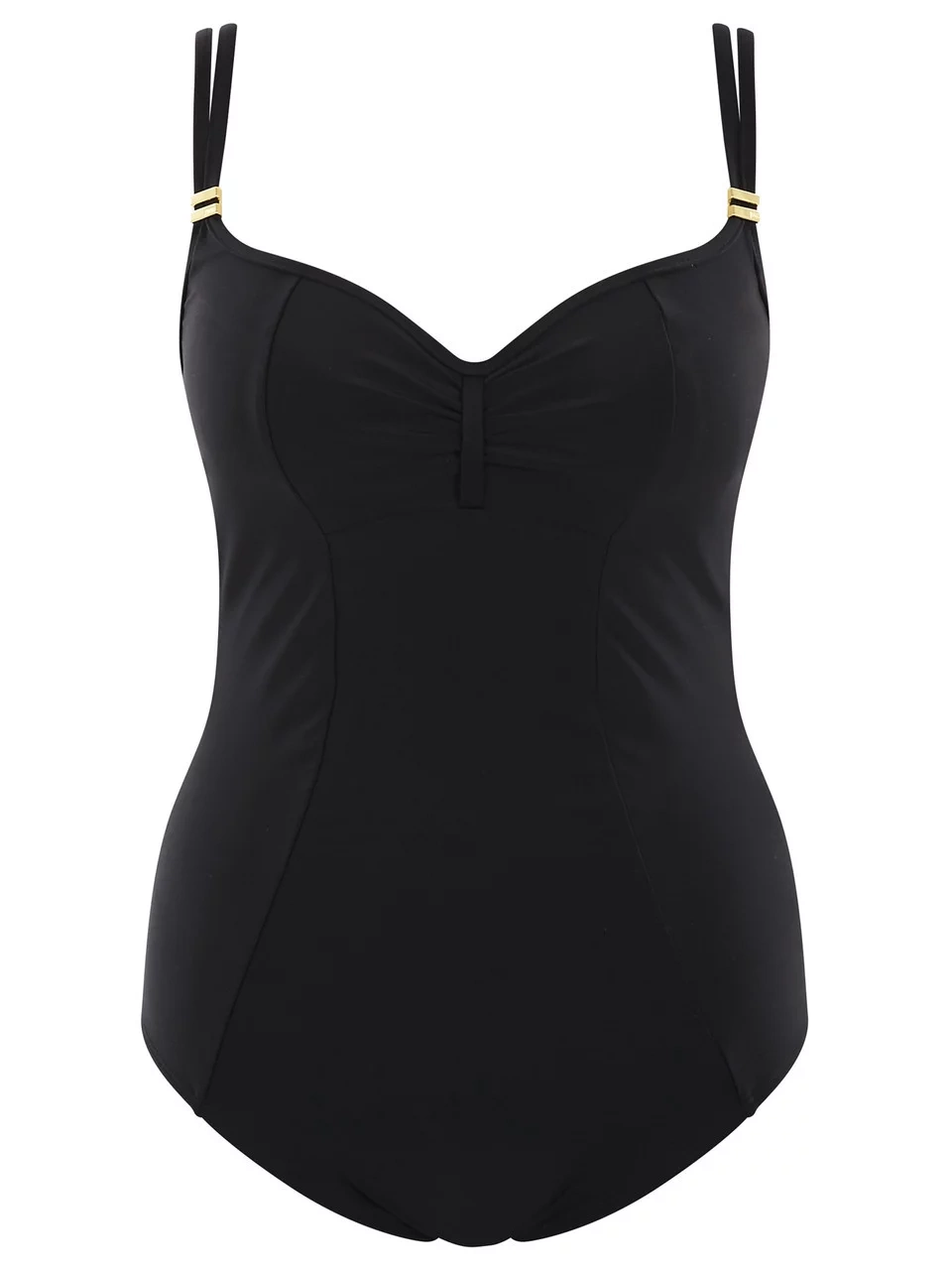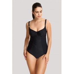 Jednodielne dámske plavky. Podprsenka nevystužená, s kosticou, ramienka na posúvanie, zadný diel len s miernym výkrojom, poistený ďalším hrubým zapínaním na chrbte.