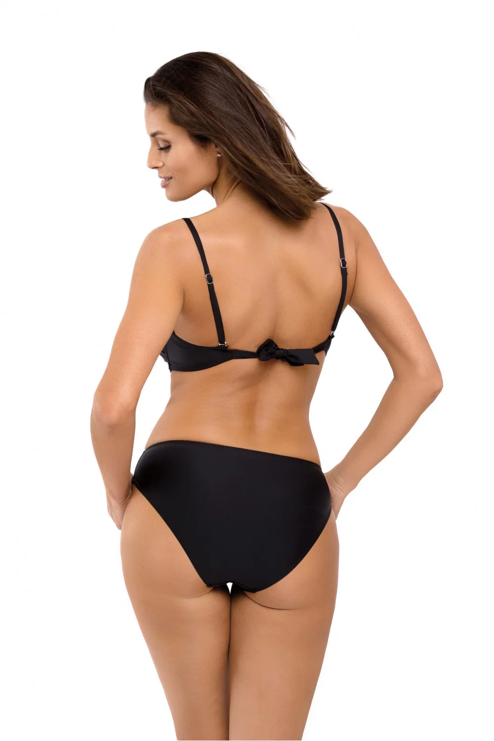 Hladké, jednodielne dámske plavky - monokiny bez ozdôb, ktoré však perfektne napodobňuje najnovšie trendy, aktuálne kubánsky plážový štýl. Vrchná časť plaviek skrýva vystužené košíčky s kosticami, ktoré sú vystužené špeciálnou penou so zabudovanou vypchávkou push-up. Vďaka vypchávkam môžu byť prsia nadvihnuté viac hore a do stredu dekoltu, zároveň vyzerajú opticky väčšie. Zmyselný volán dekolt zvýrazní. Ramienka majú možnosť celkového odopnutia. Obvod sa zaväzuje na chrbte. Na bokoch sú atraktívne výstrihy. Spodný diel je komfortný, na brušku vyniká pruh látky maskujúce drobné nedostatky v jeho oblasti. Nohavičky zakryjú celý zadoček a elegantne sa mu prispôsobia. Talianska vysoko kvalitná látka Carvico Tesutti.