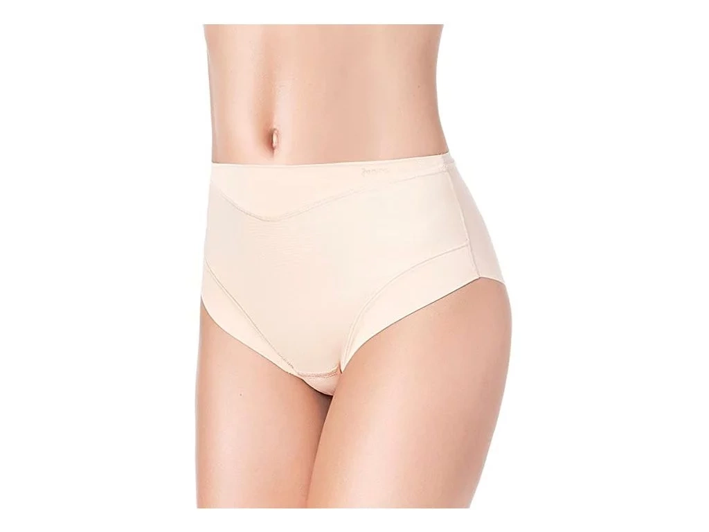 Dámske nohavičky typu "bikiny" v béžovej farbe, ktoré sú balené po troch kusoch.V páse modelu je poh