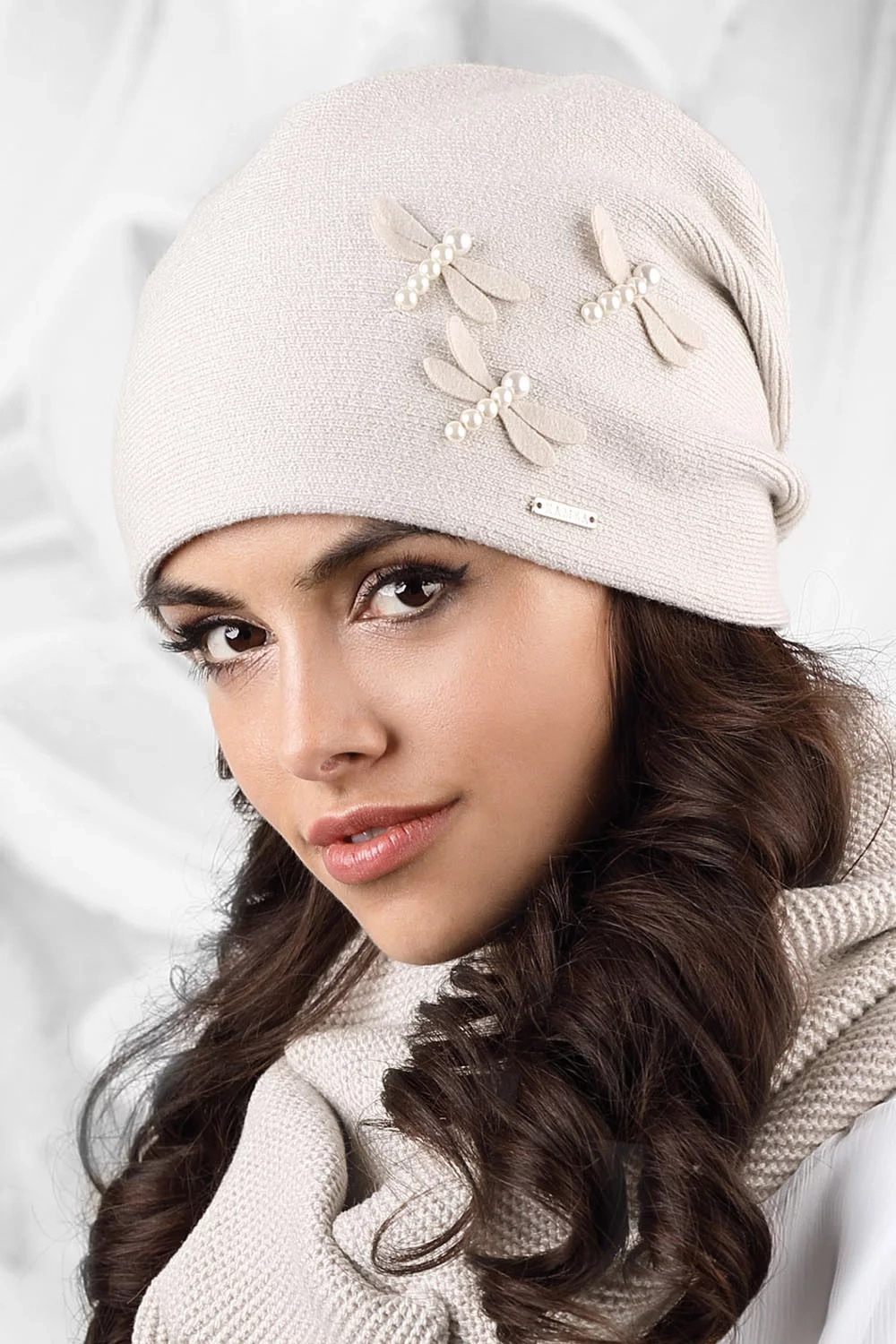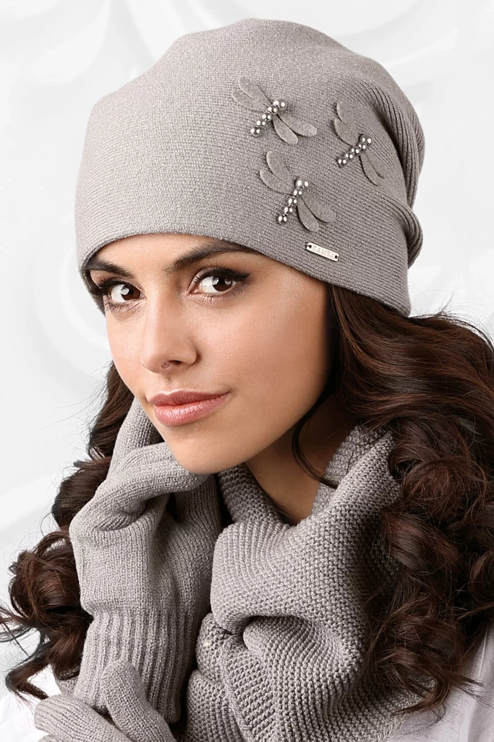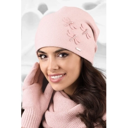 Táto hladká čiapka je ideálne vypasovaná. Model je vyrobený z tenšej priadze s prídavkom vlny a viskózy. Predný diel modelu zdobia pôvabné vážky. Na zadnom diele sú tri záložky. Čiapka sa skvele osvedčí napr. na jeseň.
