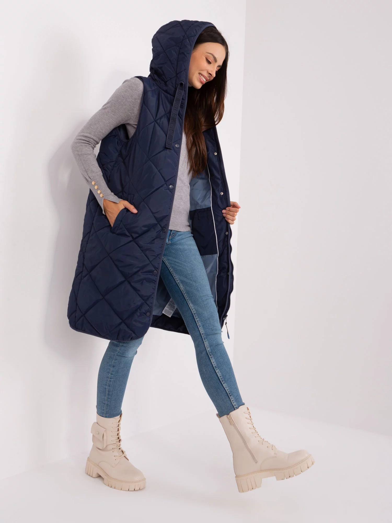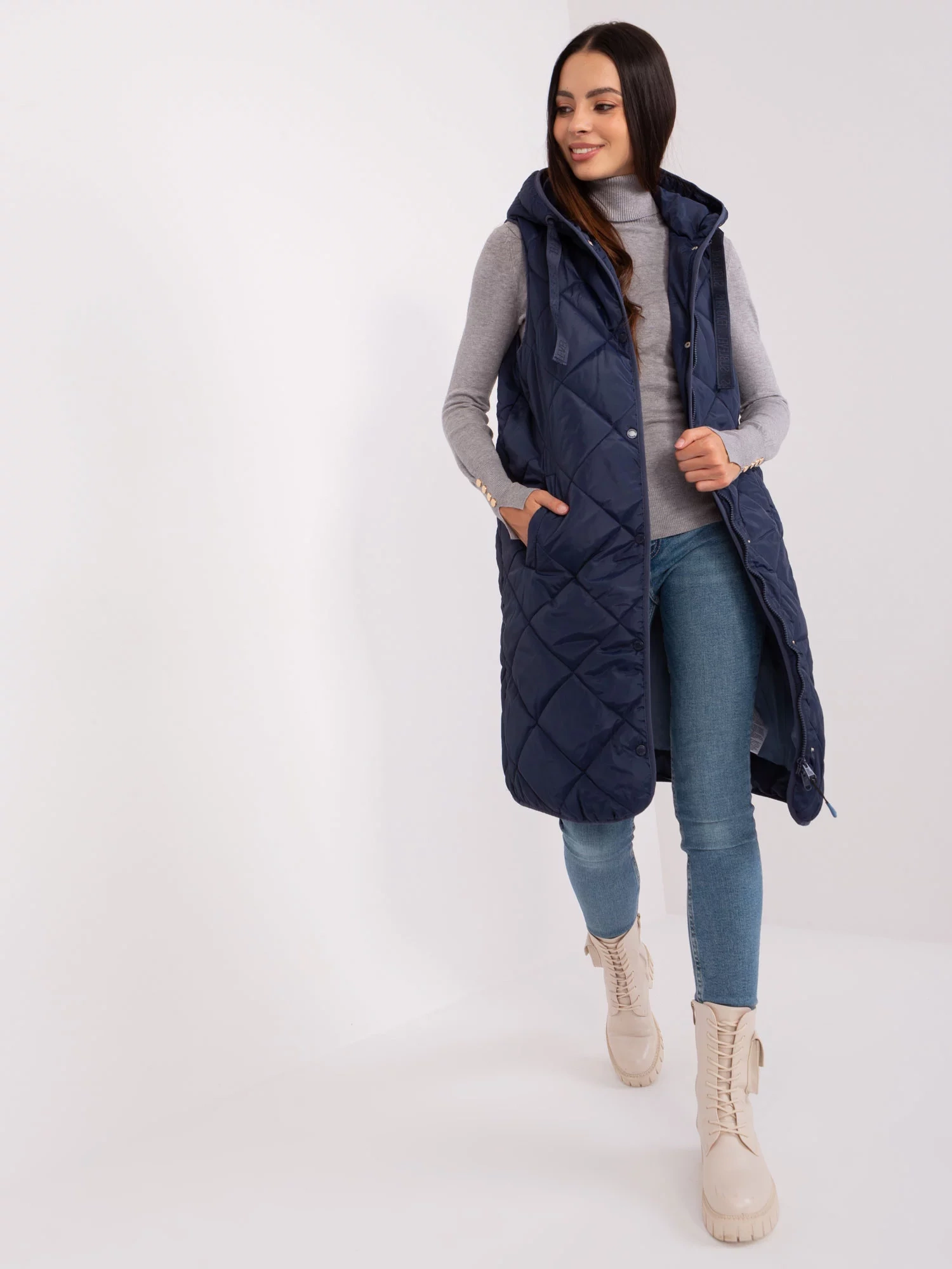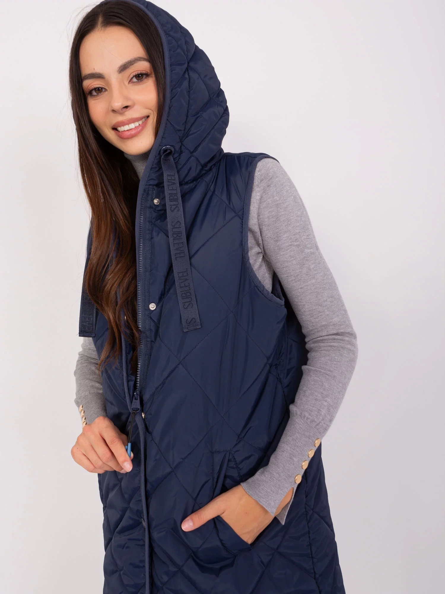 Námornícky modrá prešívaná vesta so zapínaním SUBLEVEL.