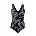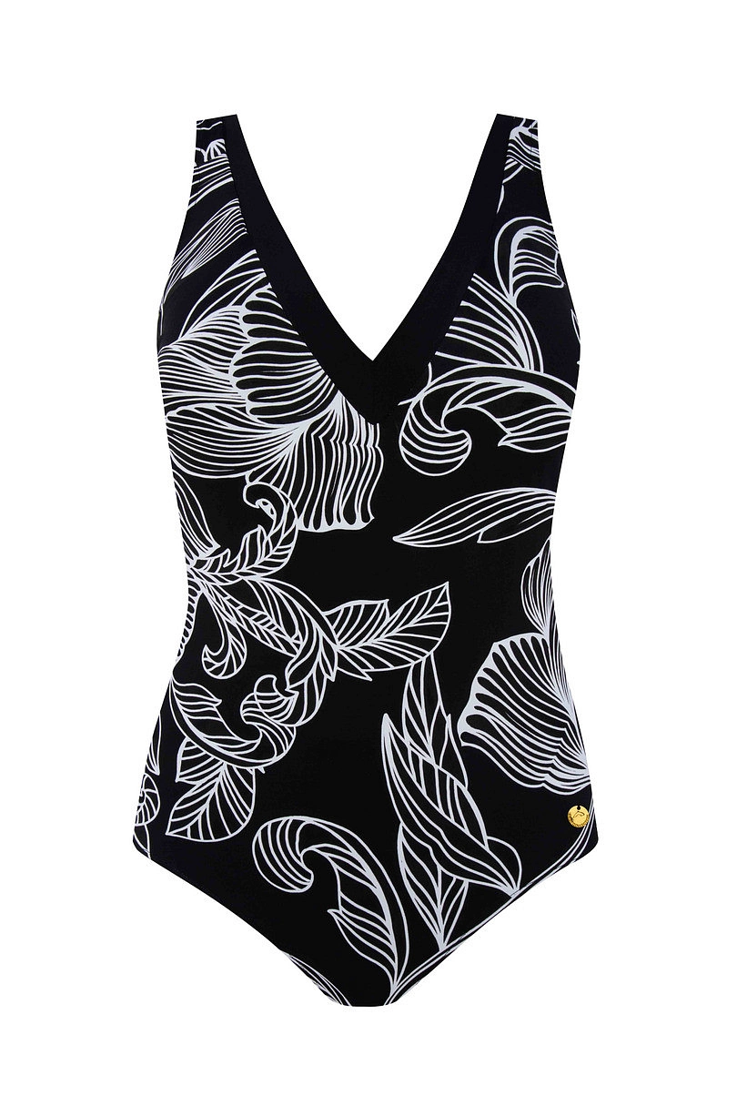 Elegancki kostium kąpielowy jednoczęściowy Madera 9 S1269 to idealne połączenie stylu, komfortu i funkcjonalności. Model wyróżnia się modnym, kontrastowym wzorem roślinnym, który optycznie wysmukla sylwetkę i przyciąga wzrok. Głęboki dekolt w kształcie litery V podkreśla kobiece kształty, a starannie zaprojektowana konstrukcja zapewnia wygodę noszenia zarówno na plaży, jak i na basenie.