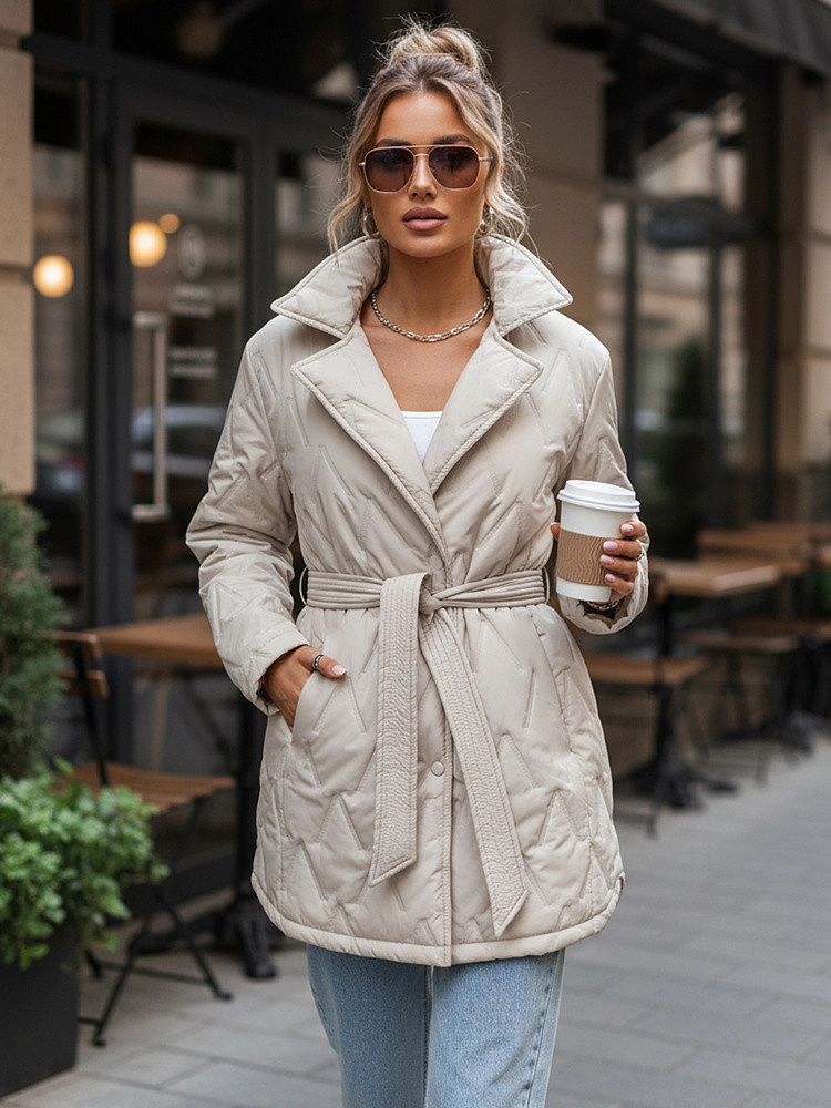 Pikowana kurtka przejściowa z paskiem w talii łączy funkcjonalność z kobiecym fasonem. Lekko ocieplana konstrukcja sprawdzi się w chłodniejsze dni wiosny i jesieni. Wiązany pasek pozwala podkreślić talię i dopasować krój do sylwetki, nadając stylizacji eleganckiego charakteru.