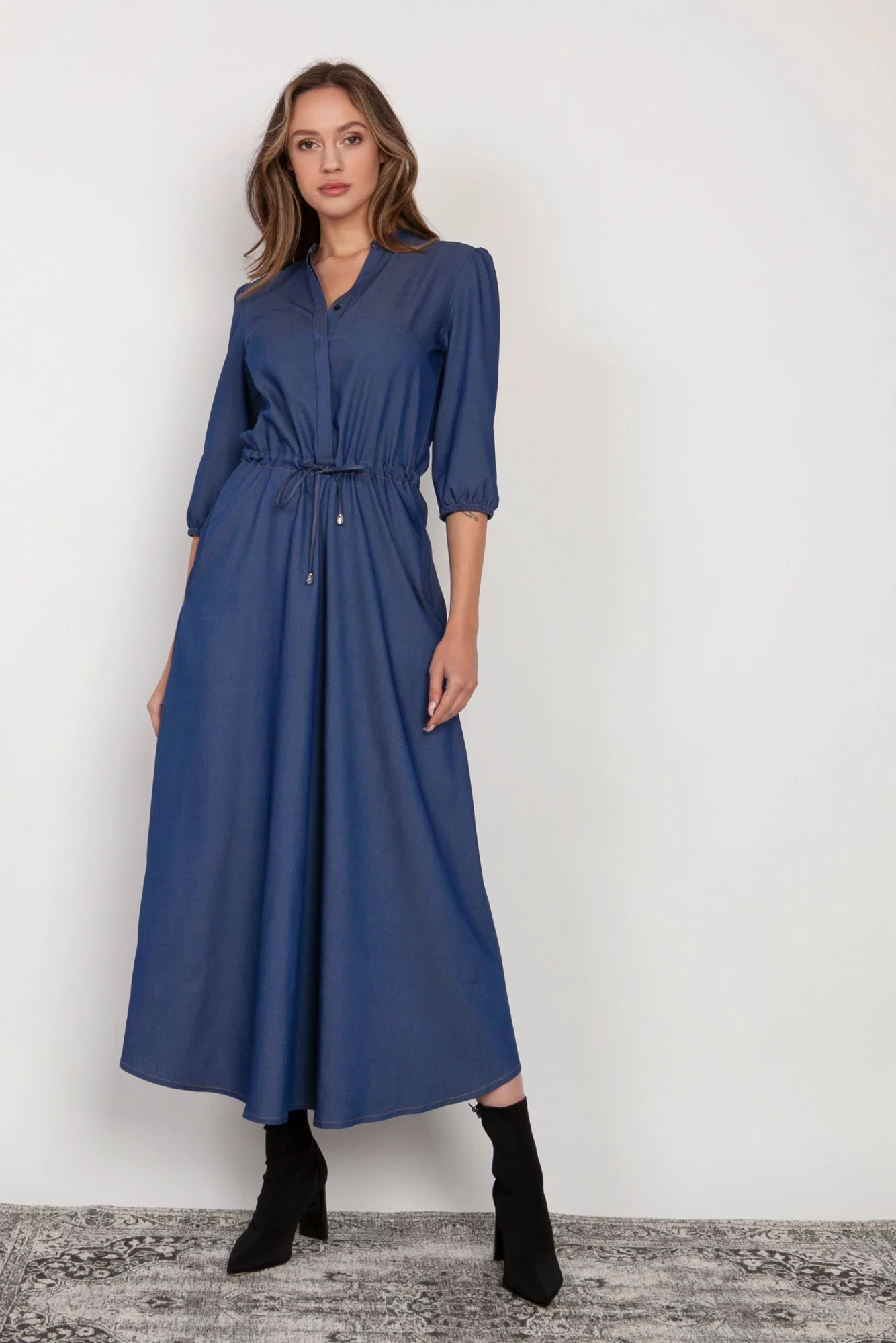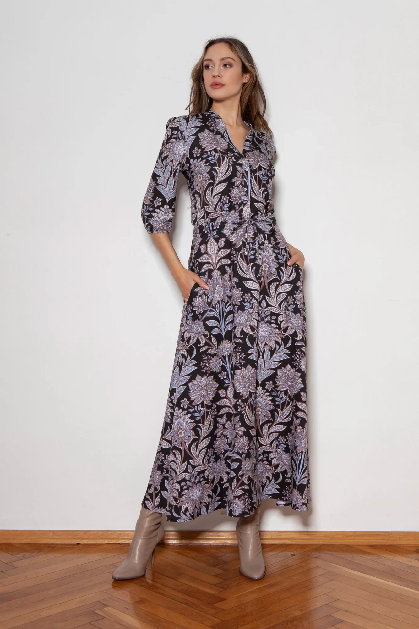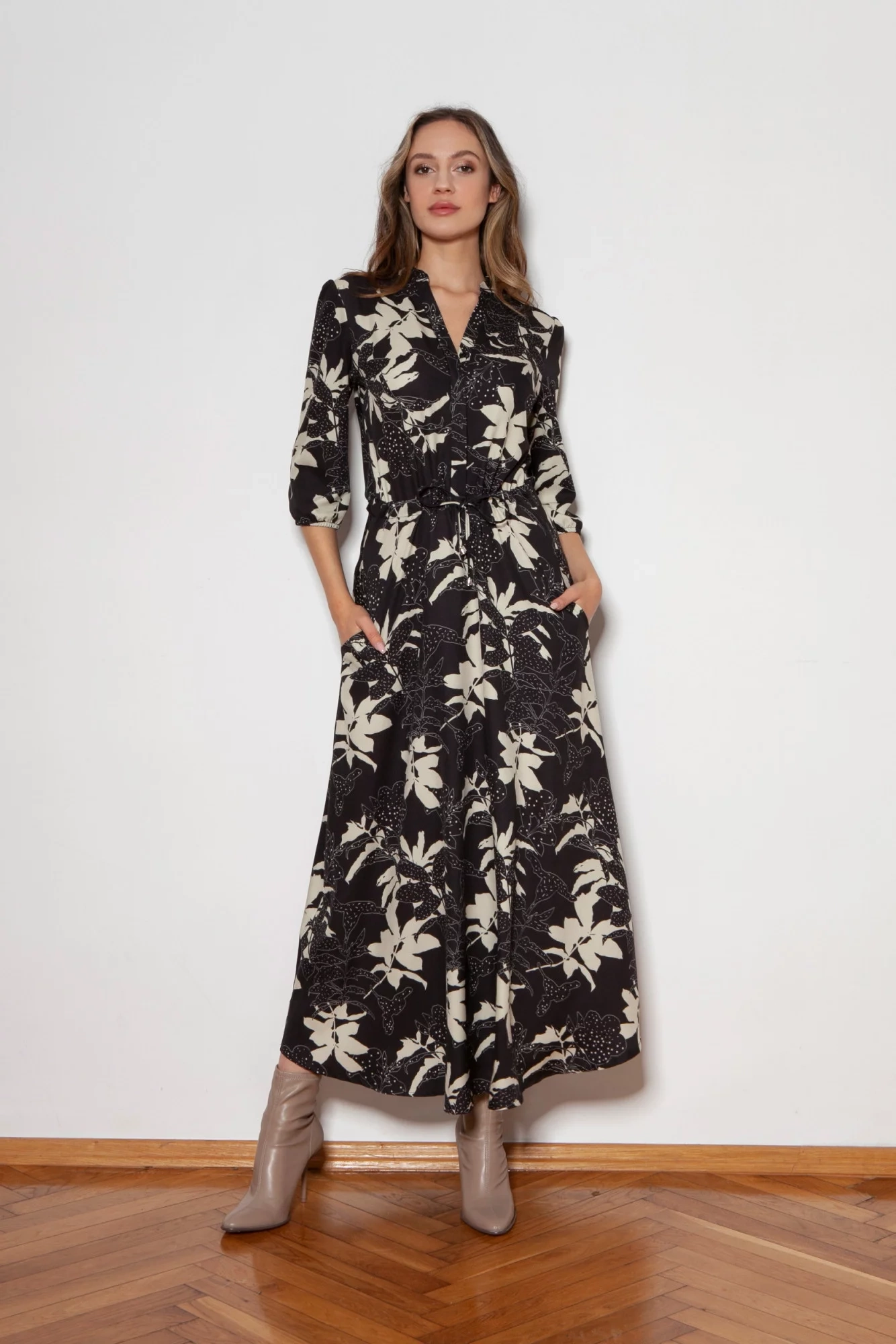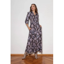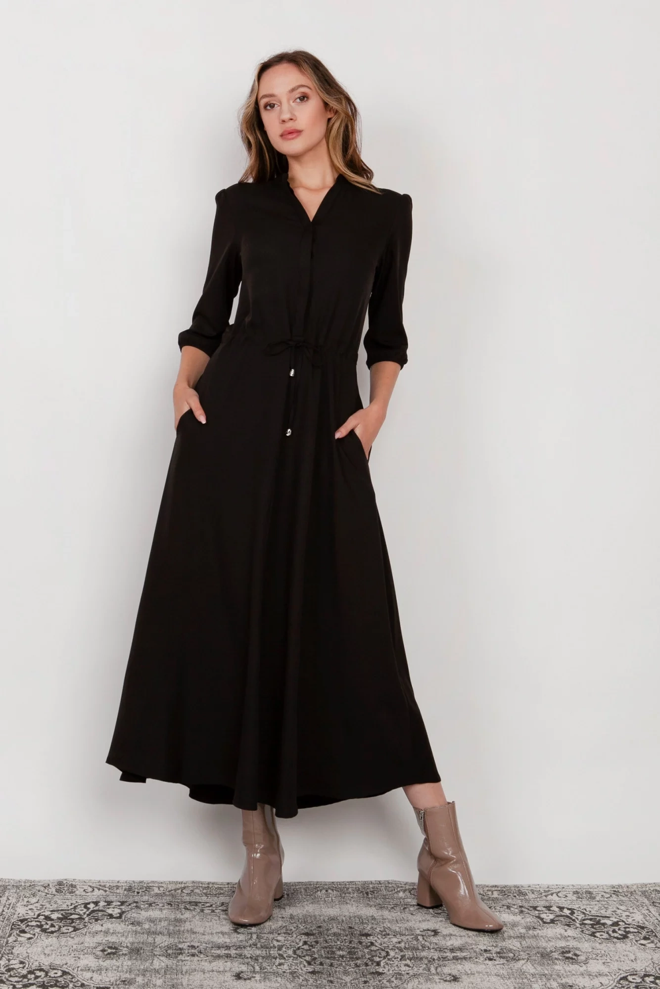 Pohodlné maxi šaty vyrobené v Poľsku. Vysoko kvalitné tkaniny. Rukávy v 3/4 dĺžke zakončenej gumičkou. Šnúrka v páse, ktorá umožňuje prispôsobenie postave. Vrecká v bočných švoch, rozšírená spodná časť, ktorá sa krásne pohybuje pri každom kroku.