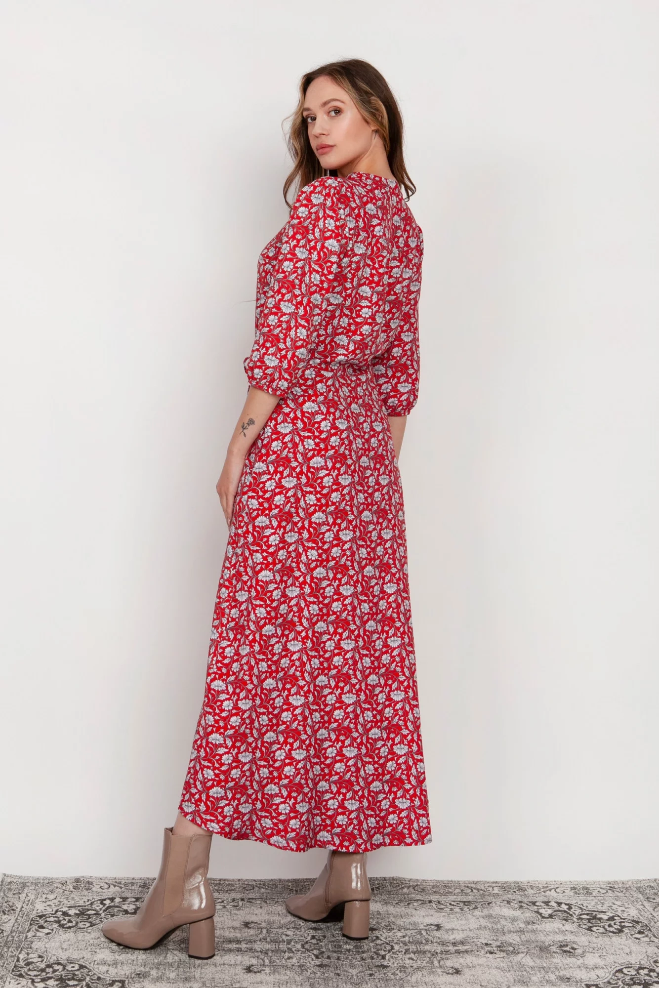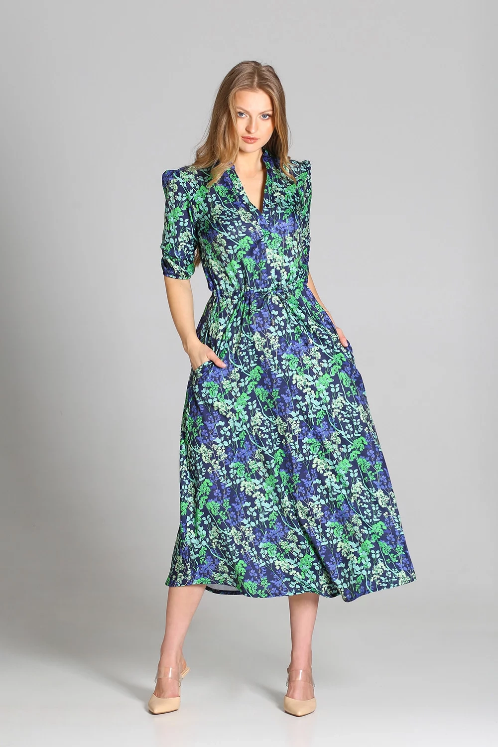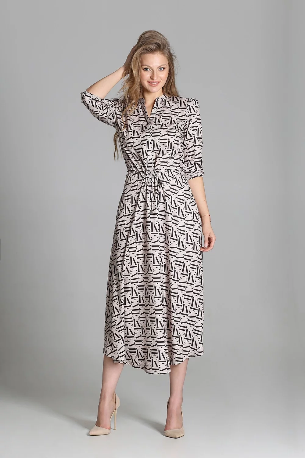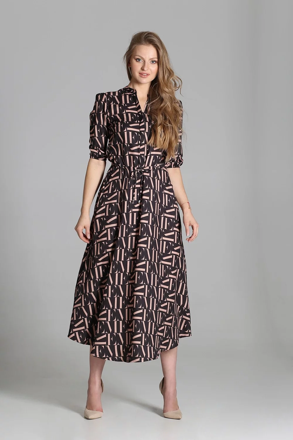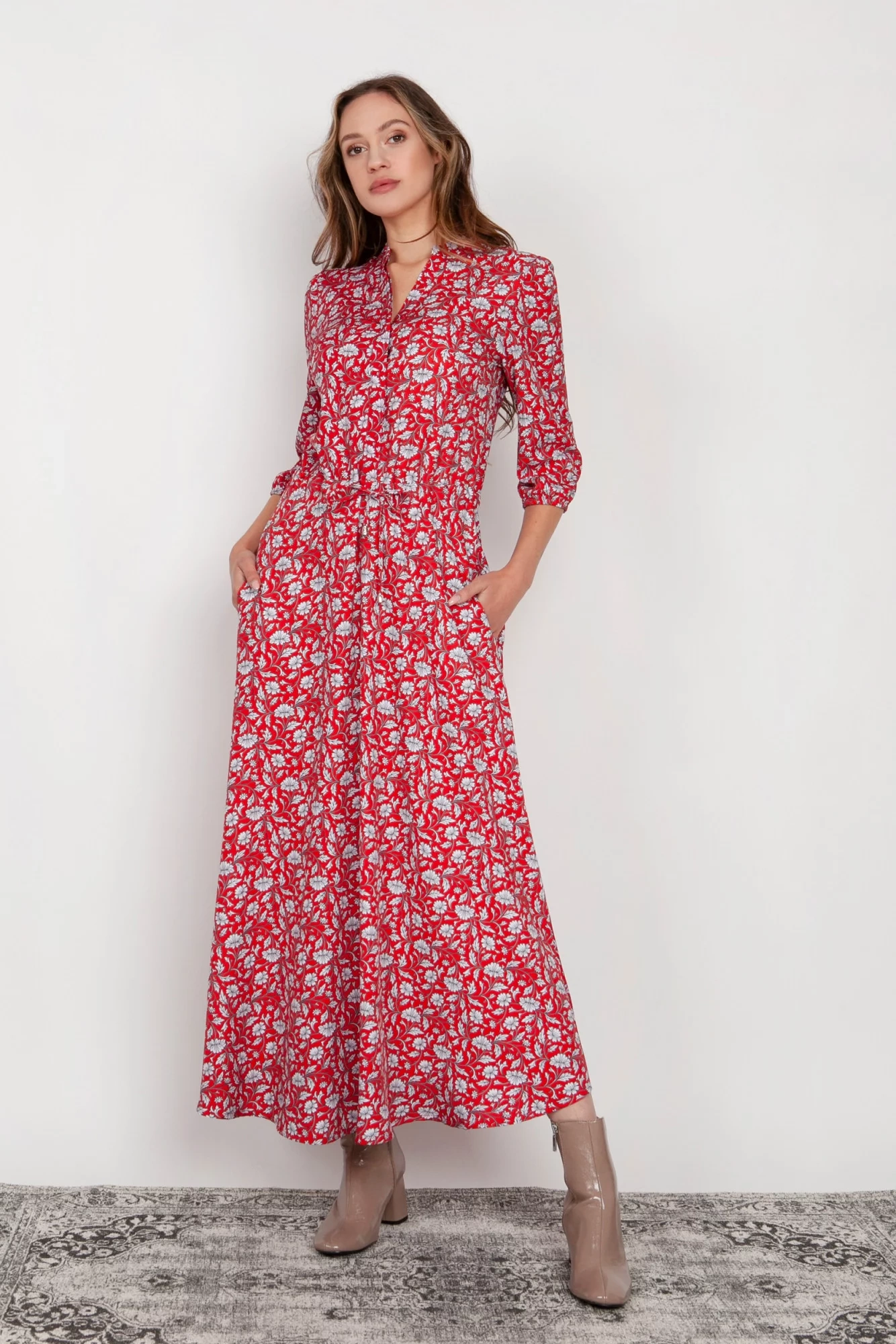 Pohodlné maxi šaty vyrobené v Poľsku. Vysoko kvalitné tkaniny. Rukávy v 3/4 dĺžke zakončenej gumičkou. Šnúrka v páse, ktorá umožňuje prispôsobenie postave. Vrecká v bočných švoch, rozšírená spodná časť, ktorá sa krásne pohybuje pri každom kroku.