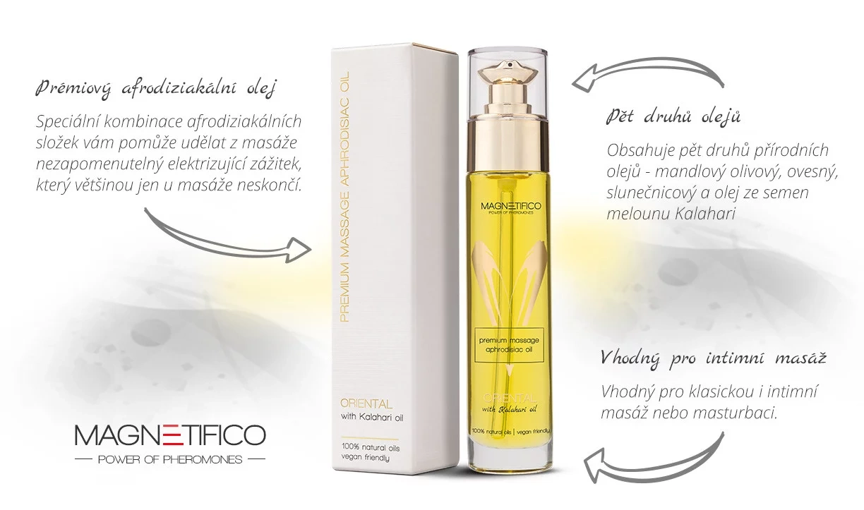 Nechajte sa rozmaznávať a prežite nezabudnuteľné chvíle plné vzrušenia i relaxácie. Tento masážny olej z radu MAGNETIFICO – power of pheromones bol navrhnutý tak, aby zaistil optimálnu klzkosť a nebol zároveň príliš mastný a prirodzene sa tak vstrebal do pokožky. Špeciálna kombinácia afrodiziakálnych zložiek vám pomôže urobiť z masáže nezabudnuteľný elektrizujúci zážitok, ktorý väčšinou len pri masáži neskončí.