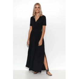Dlhé šaty s hlbokým výstrihom. Krátky rukáv, masívna guma všitá v páse.